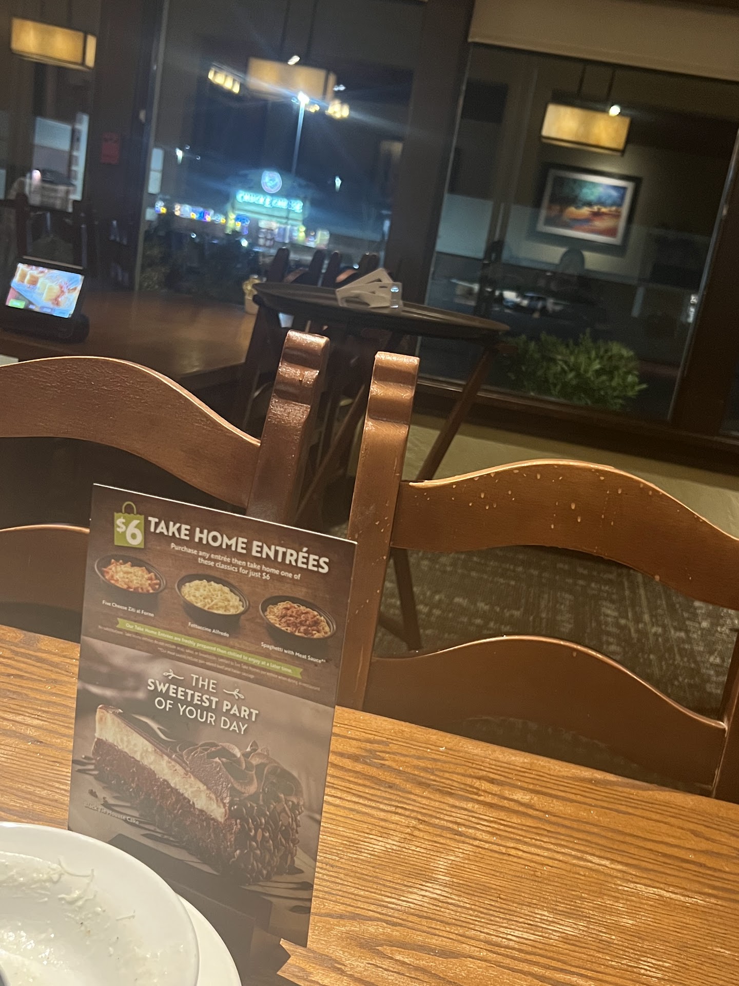 The part we did mind was when he tripped? and broke another table’s cocktail glass right above our table. The liquid was spilled on our table and I’m not sure if any glass was scattered around. He did not even apologized to us and proceeded to apologize to the table who did not receive their cocktail. He came to us and check if there was any glass, but did not even take a towel to wipe down the spilled drink. We spent the rest of the night with a wet table (see pic). He even then went on to apologize to the table next to ours to have spilled the drink so close to their proximity, and not once stopped to apologized to us. At this point we just found this ridiculous and just wanted to pay and go home. He proceeded to ask us if we wanted a refill of any soup and breadsticks, which I know isn’t allowed if we shared the entree, but thought this was part of the restaurant’s courtesy for the drink spilling. So I said sure why not, BUT then he starts going “Oh wait no, you guys shared the entree, that means you don’t get refills”.. I wasn’t going to ask in the first place until you offered, and him saying that just made us feel broke.