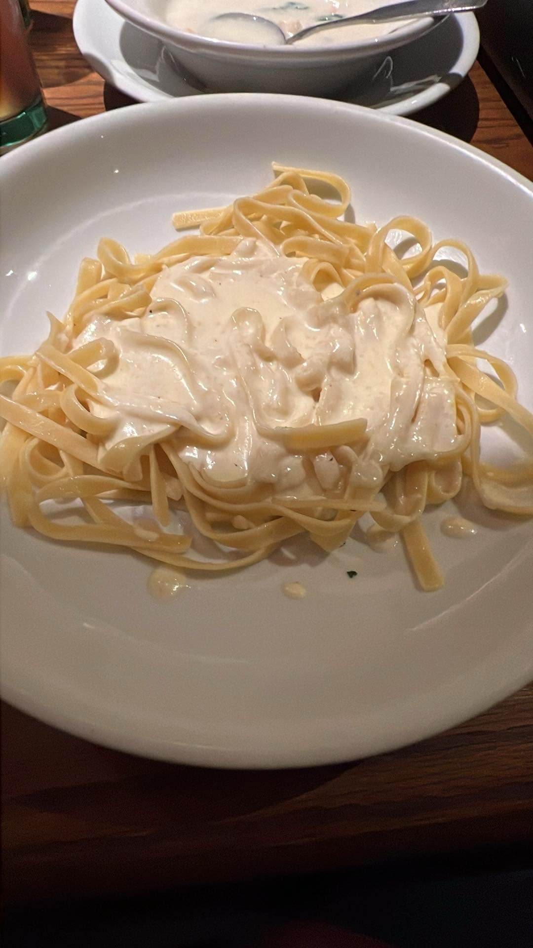 Like I said I worked at Olive Garden and I know how portions sizes are supposed to be served. We chose to do the never ending pasta and my first plate which should have been a big portion was only a portion of realistically 3 bites, and also my pasta was cold and noodles weren't cooked all the way. . My second bowl I decided to get was the Rigatoni with 5 cheese marinara and I was brought cold and uncooked rigatoni with marinara. I know the difference between marinara and 5 cheese marinara. I also ordered chicken gnocchi as my soup of choice and the two times I ordered it the gnocchi was literally freezing cold and the soup was way too chunky.
