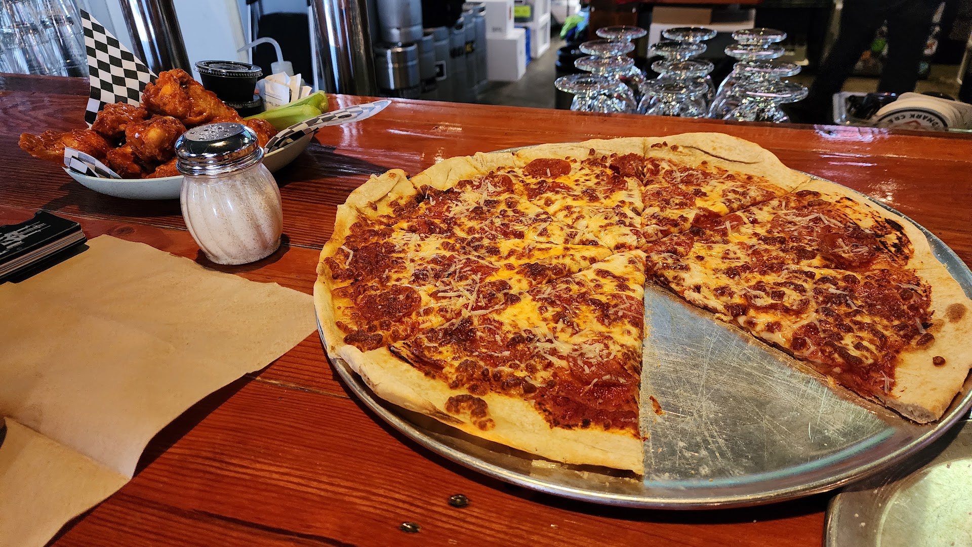 They only serve pizza for food, but it is quite good pizza. And if you're not interested in that, you can bring in your own food or even have it delivered. I've had Uber Eats drop food off several times.