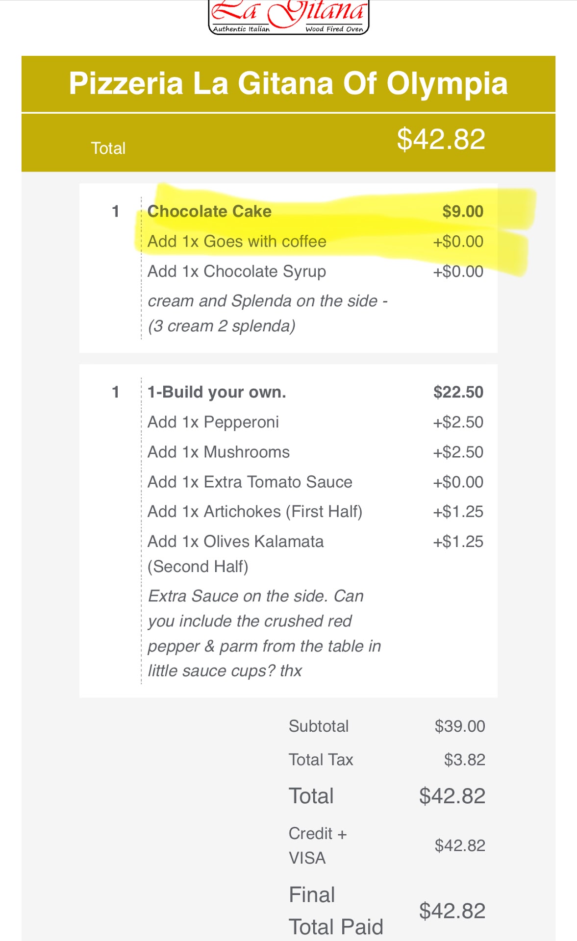 On Sunday, May 12, 2024, at approximately 5:10 pm PDT, I placed an online order at Pizzeria La Gitana Of Olympia located at 501 Capitol Way S, Olympia WA 98501. Part of my order included the following. Please note that the next line was copied and pasted directly from my online receipt (see photo)