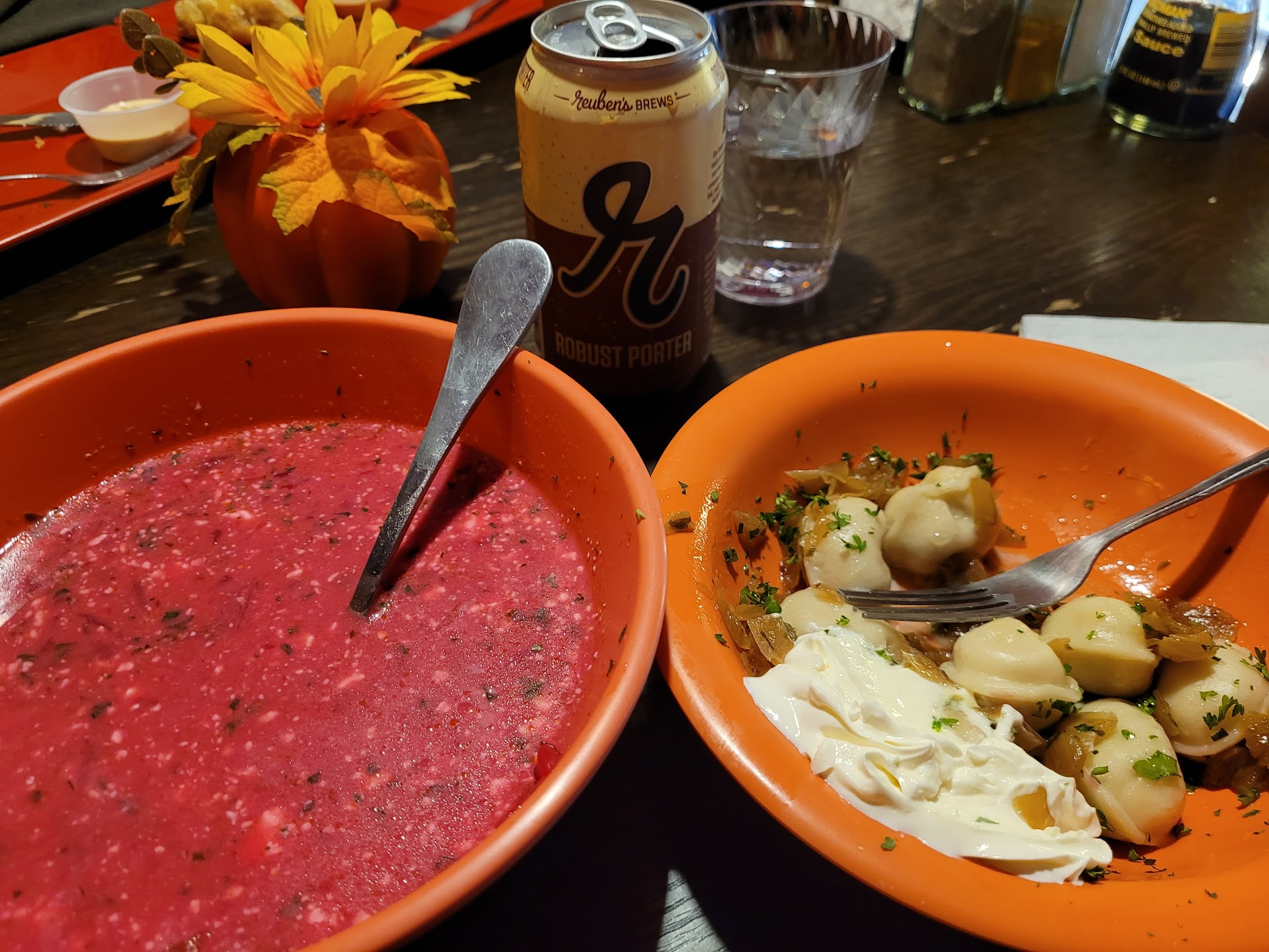 This was my first time eating Borscht and I fell absolutely in love with it. It was so much creamier and filling than I had expected, and they gave me a nice big bowl of it. The beef was so soft I almost believed it was a vegetable (though the rich flavor could only be beef). As for my dumplings, I adore their meat dumplings. The sour cream and caramelized onions combine to create a perfect bite each time, and the onions in particular taste so good that I'd often eat a spoonful of them alone.