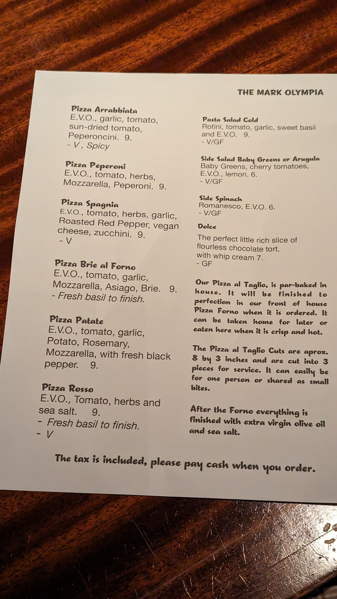 Read moreUnreMarkable! - What a disappointment. The Mark is an Olympia favorite but the new plan fell far short or our high expectations. Drinks average, pizza well below average (nearly raw and doughy on top and overdone on the bottom and flavors less than special) and customer service pretty bad. Let’s face it making pizza ahead of time then “finishing it off” is not the best method of preparation and Oly is not exactly known for restaurants with good service? I love how the server made her problem, attending to other customers who arrived after me, my problem by telling me I should have spoken up earlier rather taking responsibility for not paying attention and then showing considerable attitude when challenged. This on top of watching her make other server errors with her customers, her boss having to explain things to her and her work mate asking her to not just call out orders but put them in the system. My sister ordered a bottle of wine and five glass but was uncomfortable carrying all of it to the table. Once I finally got to place my order I took the tray of glasses to the table and as I’m about to return to pay the sever had chased me down to say come back and pay for what I had ordered in a not so nice tone. This person has no clue / customer service skills. Seriously doubt we will be going back. Based on the experience and the fact so few people were there on a Saturday night if things are not corrected The Mark’s survival might...