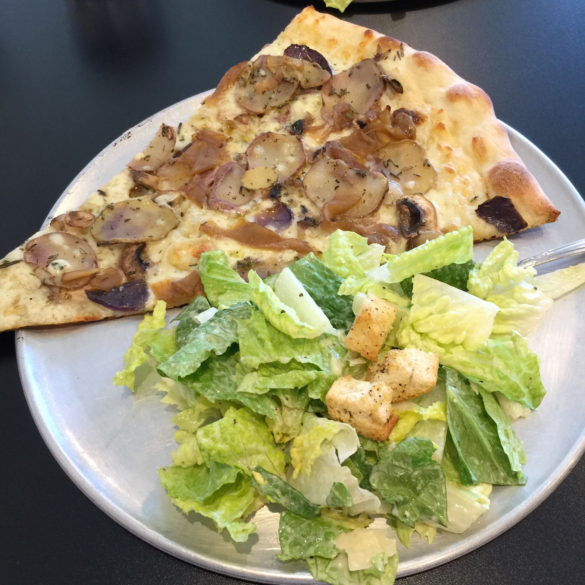 I decided to try this out for a light brunch. The place is intimately small, with bench seating, bar seating facing a window, and a few tables. Pizza by the slice had three choices, and since it was expensive to build your own, I opted for a Mediterranean slice, and a slice of pepperoni.