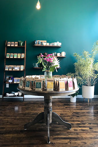 The jars of tea leaves along the back counter wall show off their hand crafted, small batch blends.
