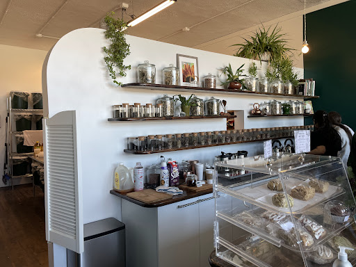 First of all, it’s BEAUTIFUL inside. The calm, deep paint color and live plants set off a whole vibe. There’s a few full shelves of retail products, too.