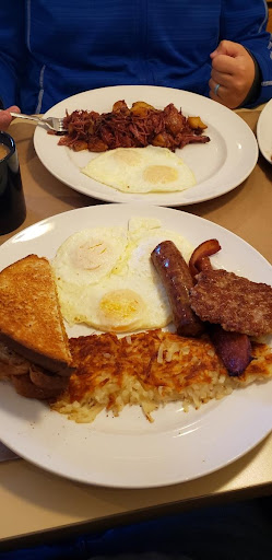 I started of with a Bloody Mary, which I find is the best way to start breakfast, and it was good. The strip of thick cut bacon added a little something to it. I than had their Porkasaurus - All things pork: bacon, sausage patty and links, Canadian bacon, ham steak, plus Andouille sausage, all on a big bed of our red taters with Jack and Cheddar cheese and crowned with three scrambled eggs. It came with toast and a small order of biscuits and gravy. I think this was a meal designed to be fed to Husker lineman, not a normal human. (In fact, by adding eggs to the left overs, I got 4 more breakfasts out of this meal.) The gravy over the biscuit was average, too mild for my taste, but everything else was delicious. They claim to have āthe best bacon in townā and they might have it, at least it is the best Iāve had. Lois had French Toast, Scrambled Eggs and Bacon. She asked for crisp bacon and she got it exactly the way she wanted it. Her French Toast was cooked perfectly and covered with just the right amount of powdered sugar.