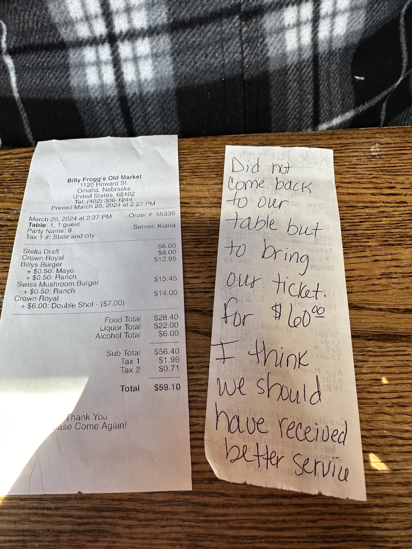 This was the worst experience I have ever received. Our server Kiana welcomed us and asked us if we knew where we was going to sit. I told her right there at that table where my keys were, I was looking at what beer they had on tap and she told me she could help me at the table. So because I felt rushed I ordered a Stella and my boyfriend ordered a crown and sprite. She just stood there so we felt pressured to order even though we just got the menus so we went ahead and ordered burgers. We was the only dine in customers except for the 2 guys shooting darts. We moved from a high top table to a booth because of the cold draft which we was fine with just wanted a warmer spot. This booth obviously hasn’t been used in a while because we swiped our hands across the table and you could see the dust flying in the air. My boyfriend got his drink that looks like straight soda. I took a drink of it which I don’t like crown but I didn’t have to worry about it because it taste just like sprite, No sign of the waitress so he went up to the bar and asked the bartender if he could get a drink with alcohol in it. The bartender was very rude and loudly told the waitress “did you get that, I am making him a double crown”. We then got our food. The burgers were good. My Stella was empty. I told my boyfriend I’m not walking up to the bar to the rude bartender and if the waitress doesn’t come back to our table I guess I will only drink the 1 drink. Waitress and bartender were both having a good old time with the 2 guys shooting darts. FINALLY the waitress came to our table and asked us if we was ready for our ticket. She said it was 60.10. She took our debit card. I walked up to the bar and asked how much they charge for drinks and the bartender rudely said it depends on what you drink. I asked for a print out and also the managers name and the only response I got was he’s not here. The waitress brought us the receipt to sign and asked us if we wanted to do a shot with them!!!! Are you freaking kidding me!!!!!! That’s probably where the first shot that didn’t go in my boyfriends drink went!! Dirty, rude, and...