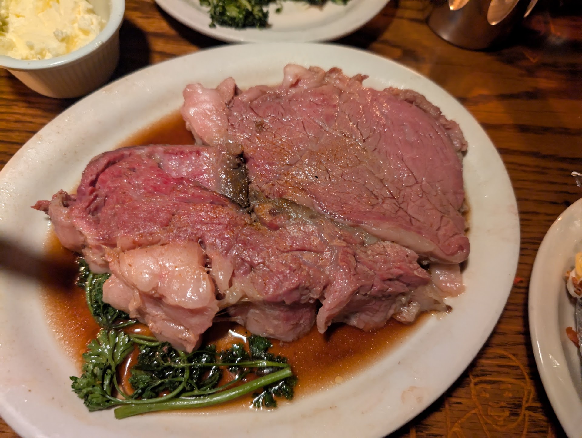 I had high hopes going into this restaurant for the first time, the ambience of the place is very nice, and the menu, particularly the prime rib seemed very promising from other images and reviews I saw, however I left very disappointed and confused. After being seated, it took around 10 minutes for us to get our waters and bread. Not a big deal as it was decently busy, but then after we had placed our order, we had waited a staggering 45 minutes to receive our food. Table next to us had a similar experience. Reasoning I heard being the head chef was away that night. That might explain the prime rib I received after an extended wait. The prime rib had no crust, in fact it looked like someone with a jackhammer removed the entire crust of the steak, or ate it themselves. Maybe it was left under the broiler for too long and burned and to salvage it they removed the crust. I had asked my waitress what had happened and she claimed that's just how prime rib is served. I wish I gave a bit more pushback than I did since I know better, and the resulting piece of beef was essentially just a bland, unseasoned slice of sous vide beef served with lukewarm jus that still had unmelted fat floating in it despite the small candle lit under it. She did offer to have the kitchen prepare us another piece, but having just waited 45 minutes to receive the food, I would've eaten a plate of sawdust at that point. After a disappointing entree, I had hoped if nothing else I could have a decent dessert to make things a bit better. I ordered the baked Alaska. The waitress advised me it was a bit on the larger side, but since I was splitting it with my partner I didn't see that being an issue until they brought out the plate. This was essentially a full sized cake made mostly of ice cream. Being a baked Alaska, the presentation was expectedly good, some alcohol being poured around the meringue topping and burned off, giving the meringue the consistency and flavor of a toasted marshmallow, but unfortunately the inside of the cake was frozen solid, the ice cream being particularly hard and crystalized. This cake was massive, I couldn't imagine a family of four successfully splitting it, much less one or two people, which normally wouldn't be an issue; the more bang for your buck the better. But clearly there was no thought put into how anyone would actually take this melting monstrosity home in the inevitable situation that they're unable to finish it. After finishing as much as I could, I asked for a bag with some ice and a to go box to try to keep our great state of Alaska, true to size, from succumbing to global warming during the 30 minute drive back to my house. This did not work. I want to give this place the benefit of the doubt and say I went on an off day, however eating out at a nice steakhouse is a rare treat for me, so I doubt I'll risk...
