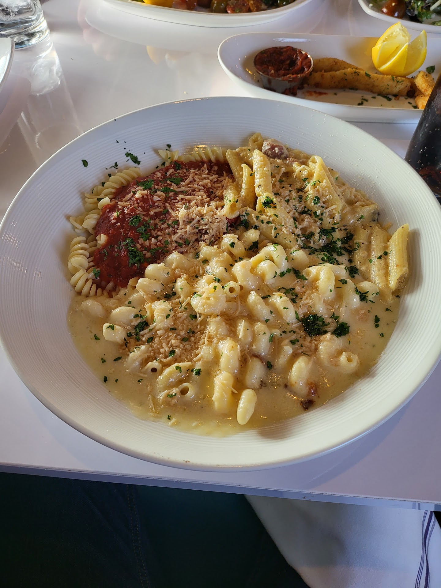 As many many others have pointed out, the bread is awesome. While others compare it to Grisantis, I am not an Omaha native and had never been there. The closest comparison I could make was with the rosemary peasant bread served at Macaroni Grill. The marinara with it was flavorful, if a bit spicy for my usual tastes. I woukd have really liked to try it with some olive oil and fresh cracked pepper.