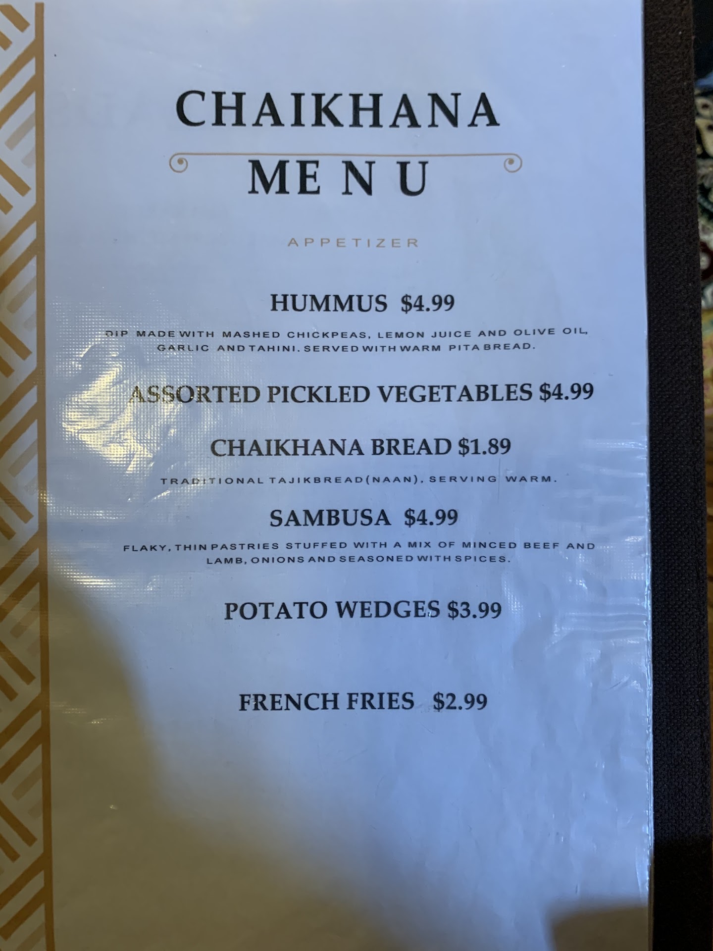 Our server, who also doubled as the host, immediately proffered menus, and after a short moment of allowing us to peruse the menu, took our drink order. (The menus themselves are very classy in appearance and complement the decor well.) After another minute or two he took our order. We shared dumplings, sambusas, hummus, lamb kebabs, and a chicken shawarma wrap.