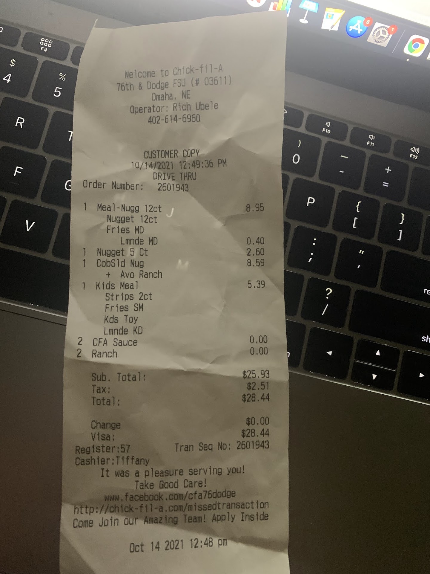 Once we got that figured out, we paid the total with her and thought that was that. Well, we get to the window and receive my husband’s drink. It was a medium drink but should have been a large. I told the employee at the window that it’s supposed to be a large meal, but she said “no, you ordered a medium.” I told her that the employee that took our order put it in incorrectly, but we had no way of knowing because she didn’t repeat the order back to us, as is the typical procedure at Chick Fil-A if I’m not mistaken. There was no offer by the employee to reconcile the issue, she just looked at me and said “Oh.” So we just took the food and left.