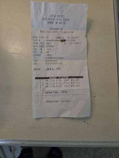Read moreThis is by far the best Chinese restaurant I have ever been to the food was terrific the service was kind and considerate and on point when it came to making sure my cup never got empty the prices were average 10.99 for dinner buffet 2.99 for drinks with free to go cups the buffet itself was pretty extensive they had every bar filled unlike other Chinese buffets in Omaha the bar with The rolls and fries and what not had Lids on the top of them so they didn't get stale while they were sitting there which is the first time I've seen it but then again I am from Texas the place was pretty clean and they were keeping it clean as soon as the customer left they are on top of cleaning up after that customer instead of letting it sit there for minutes or tens of minutes. Overall I rate this Chinese restaurant of five star because the food was great service was wonderful the best Chinese place I've ever been to in my entire life check out my pictures for more...