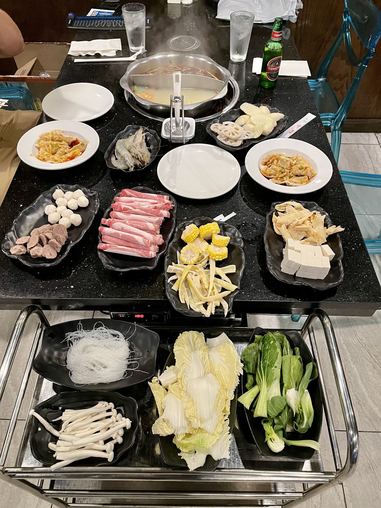 Before starting you decide what base pot you’d want - Original (milder), Hot Spicy, or half & half (this is what we got). This will be what you cook your food in. The Hot Pot is ALL YOU CAN EAT so you can fill out a sheet of what you’d like to have (you can have as many refills as you want so pace yourself). Stuff like thin sliced beef, chicken, shrimp, tofu, enoki mushrooms, rice noodles, lotus root, baby boy choy are some of my favorites. We ordered everything which made for a massively satisfying dinner.
