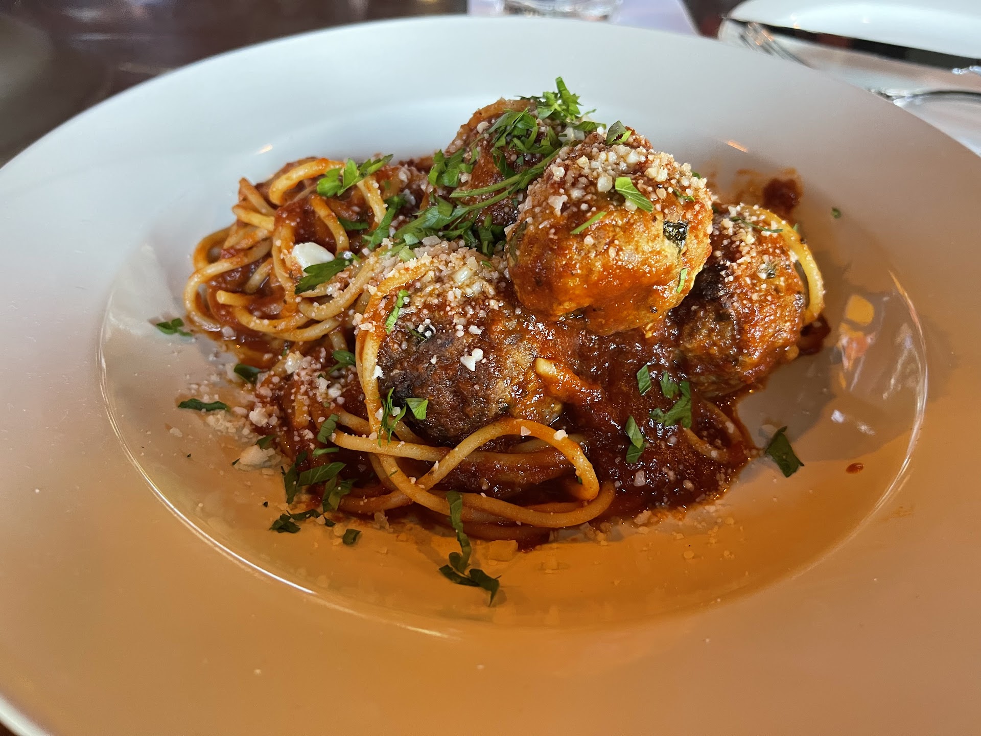 As for the Spaghetti & Meatballs, we have another winner. The Sugo sauce had just a little bit of a bite to it, a little heatâjust enough to add another dimension of flavor. The meatball portions were generous to say the very least, and perfectly tender with the just right subtle amount of crisp courtesy of the pumpernickel breadcrumbs. The small hint of rye produced as a result of using that particular variety of bread also added a wonderful dimension. The noodles, as I suspected, were another hit.