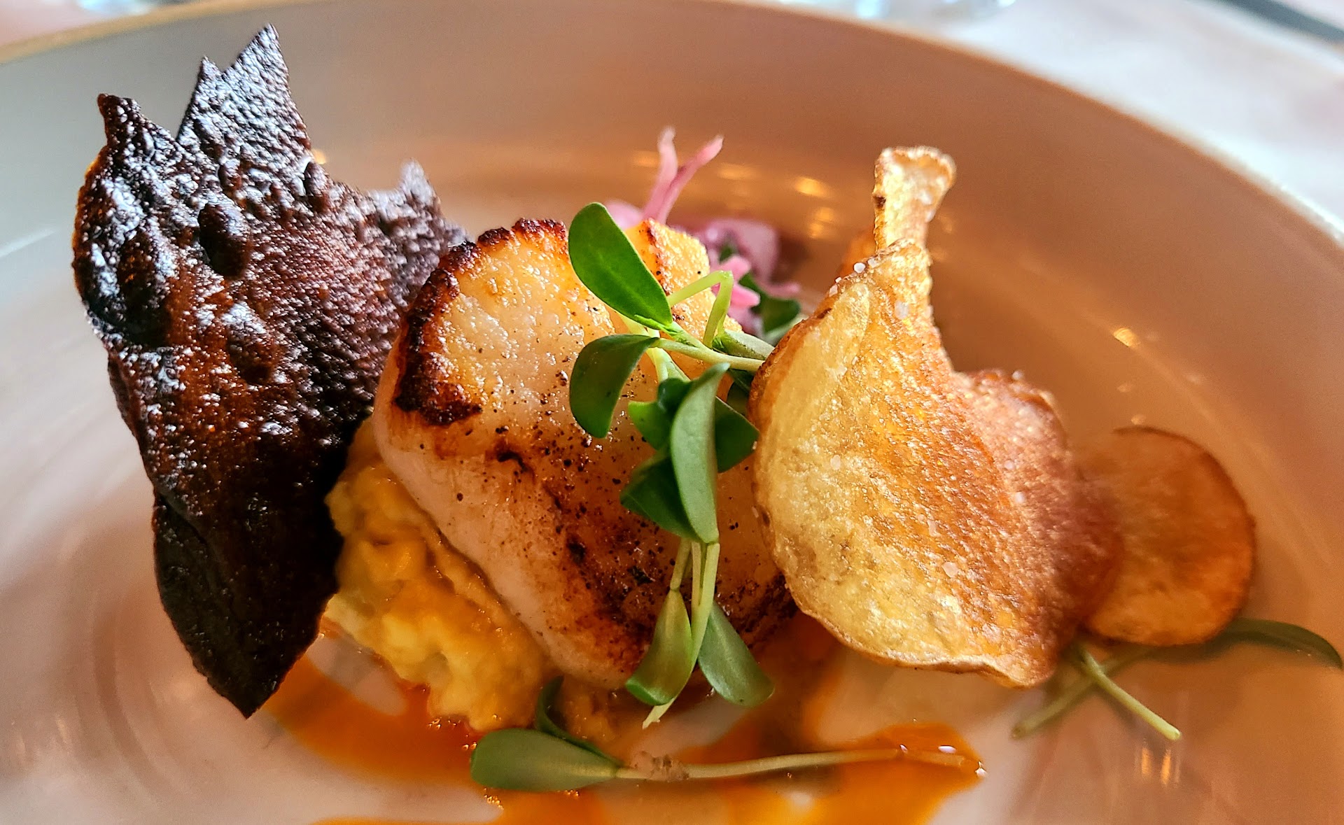 We had the Chefs 5 Course Tasting Menu and honestly all I can say is wow wow wow. I was super impressed by (and very appreciative of) their ability to accommodate my unfortunate need for gluten-free in each course. The wines were perfectly paired to bring out the complex and creative flavors in each plate. The first course was quite possibly the best sea scallop I've ever had. While I can't remember all of the specifics, it was beautifully plated with rice and potato crisps, a spicy slaw and fresh microgreens. It set the stage for the remaining courses. Second course was a fantastic and again beautiful tuna tartare. Third course was delicious duck. Fourth course was a to-die-for wagyu beef... seriously every bite elicited moans of pleasure. Sooooo good. Last course was a banana ice cream with berries, brittle and dark chocolate. It was all I could do not to lick the plates clean.