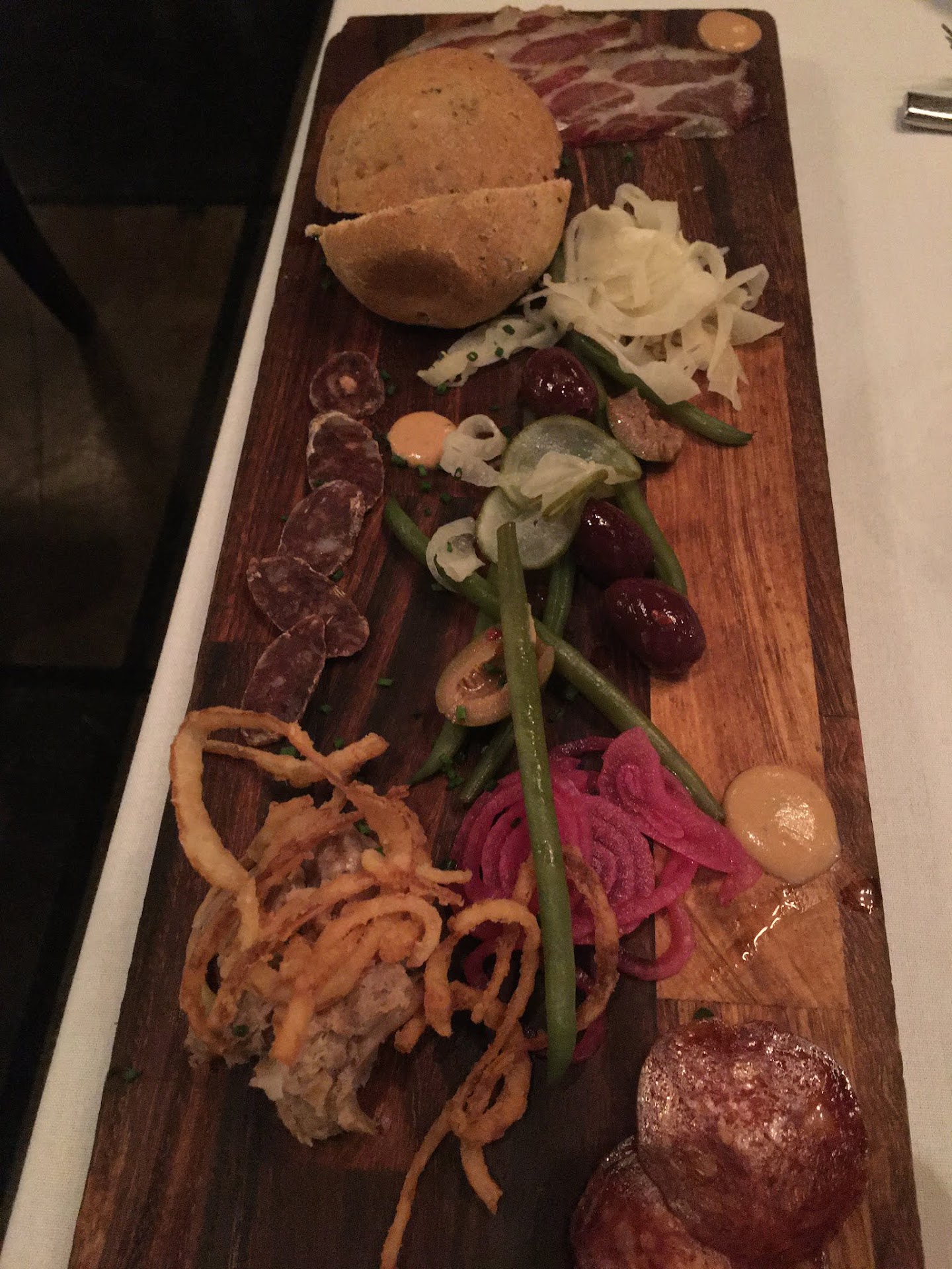 Charcuterie- It was fairly good but I think just having mustard as the only sauce accompaniment (vs. a fruit preserve/jam) and then up charging $5 to add cheese didn't feel right. I have yet to find a comparable charcuterie board since Lot 2 closed.