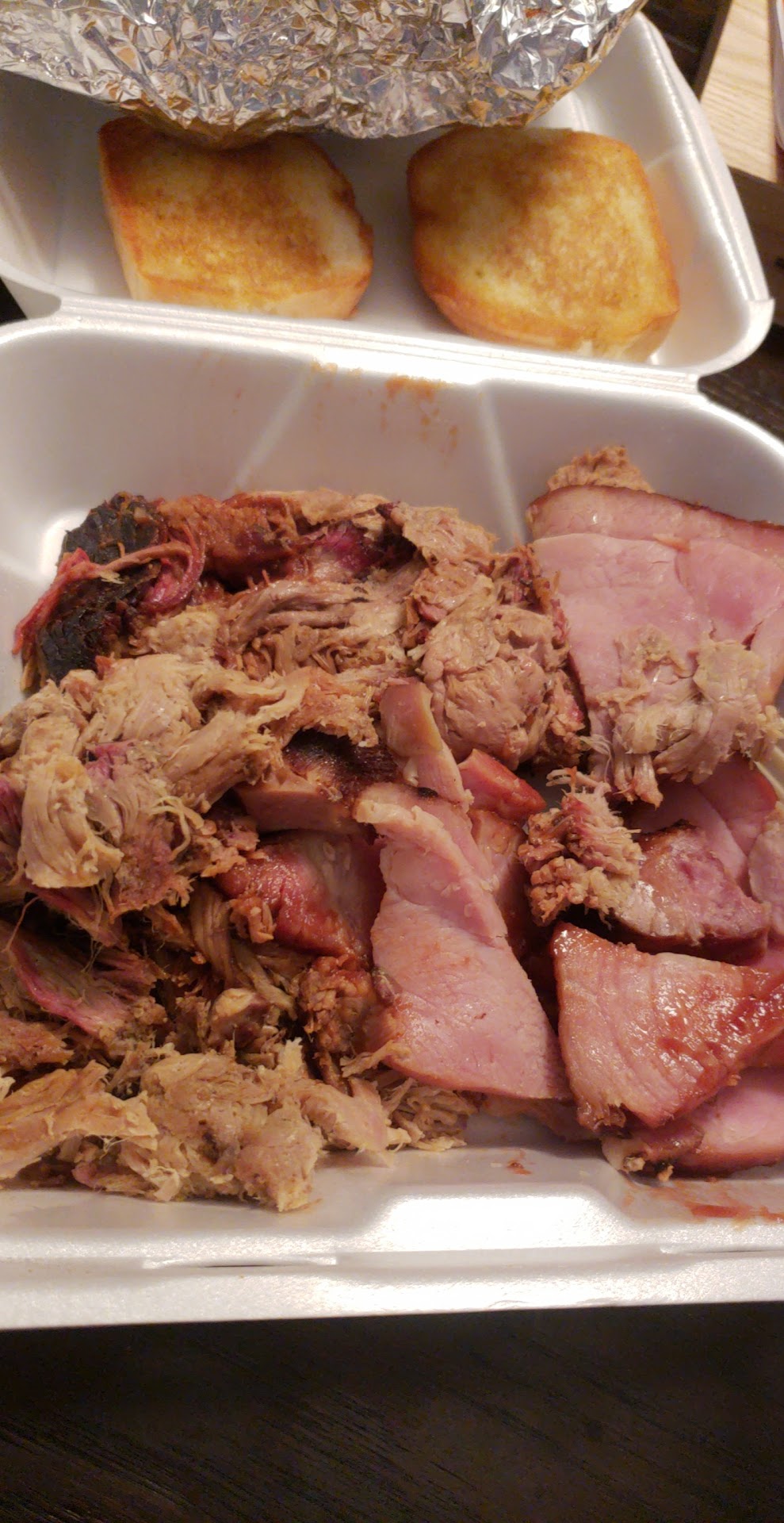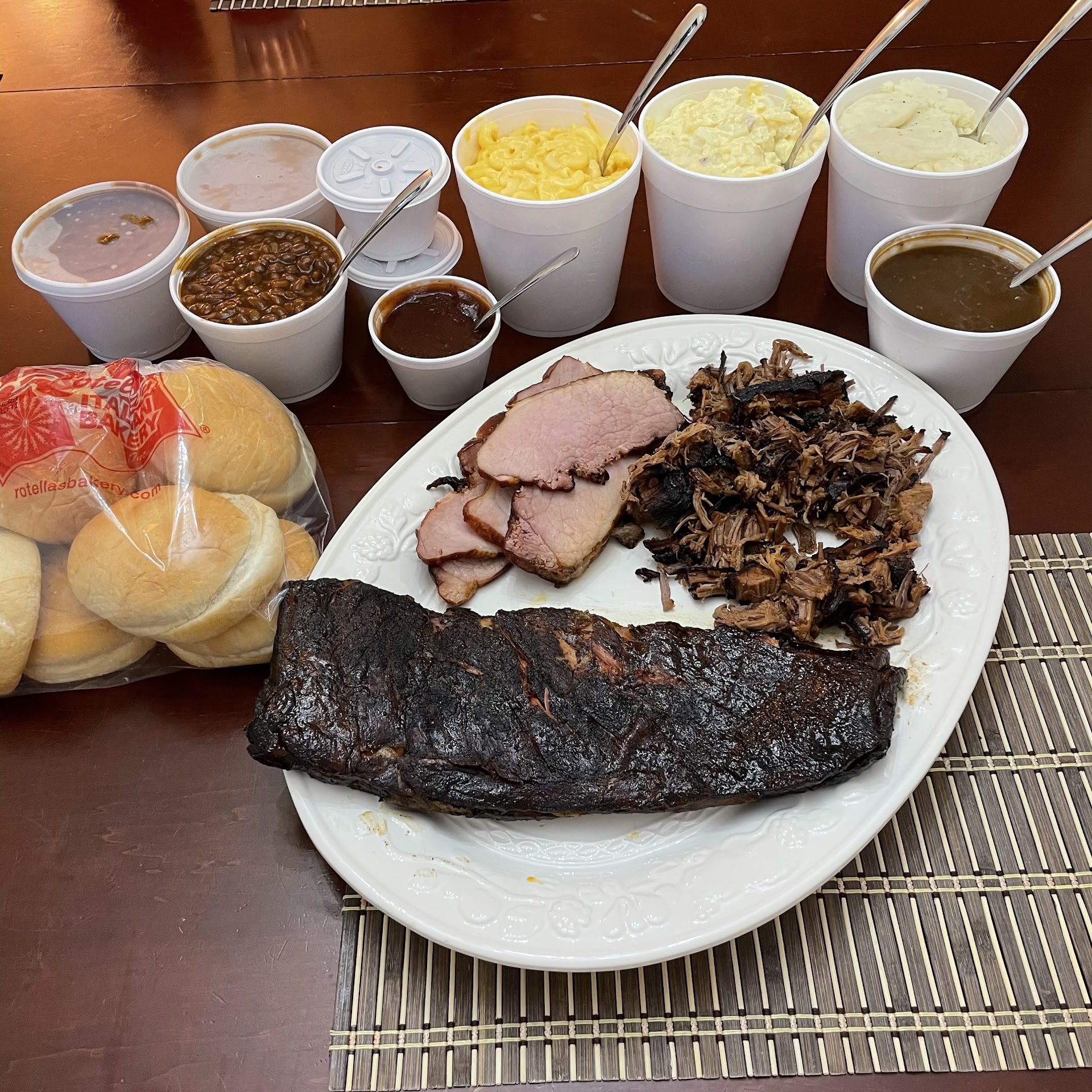 We visited on February 4, 2021. We were in the area running an errand and decided to drive through and order some food. This was our first visit and we let the cashier know that we would be a minute as we checked out the menu before placing our order. We were feeding four adults and a 14-year-old… So we decided to go with the family feast plus order a variety of sides so we could taste many items. The family feast included a full rack of ribs, 1 pound of meat, three sides and four rolls. The four rolls are Rotella hamburger buns. I thought they were actually rolls. For the 1 pound of meat we chose the brisket. You cannot choose point or flat, as it is chopped brisket. For the three sides that came with the meal, we chose all three sides as their baked beans. We also ordered a quart of potato salad, mac & cheese and potatoes and gravy. We ordered four extra rolls, again believing they were just dinner rolls. At the bottom of the sign they mention that they had smoked ham by the pound. So we decided to try a pound of sliced smoked ham. We asked for extra mild sauce on the side and our order came to just over $101.