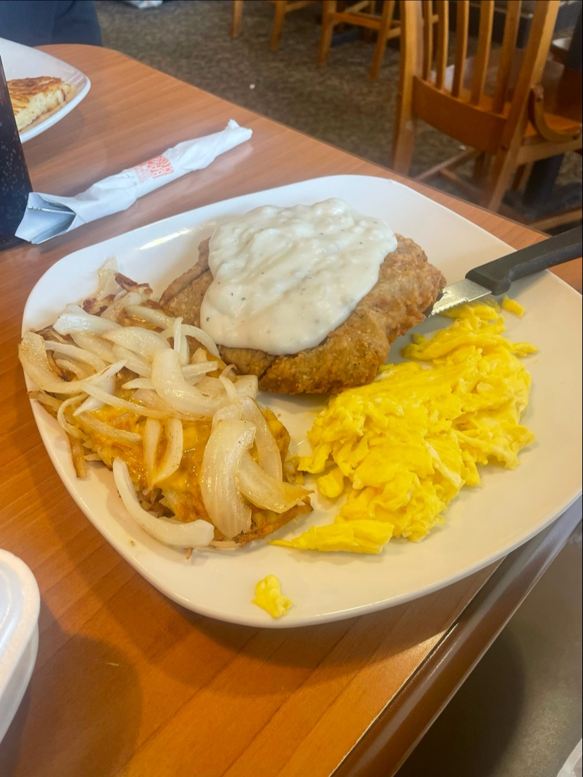 Read moreI stopped in the other day and had brunch with my bestie. We had a great experience. Food is always delicious, hot and fresh and comes out faster than you would think for being busy as can be on a Sunday. I have my go to’s here but one I never get bored of is the Chicken Fried Steak with the perfectly crispy Hash browns topped with grilled onions and cheese, 2 egg’s scrambled and their Buttermilk Pancakes (not pictured because I ate them first). I could write on and on about their Pancakes however this Chicken fried steak is always perfectly crispy, never soggy and greasy and oh is it tender! It’s also able to rewarmed the second day without losing its crispiness which is pretty impressive. I definitely will be back again, also our server was such a sweetheart when my friend and I arrived earlier than the rest of our party and allowed us to be seated while she kept an eye out for the rest of our group. Love the staff, love the food and experience, keep coming back it’s...