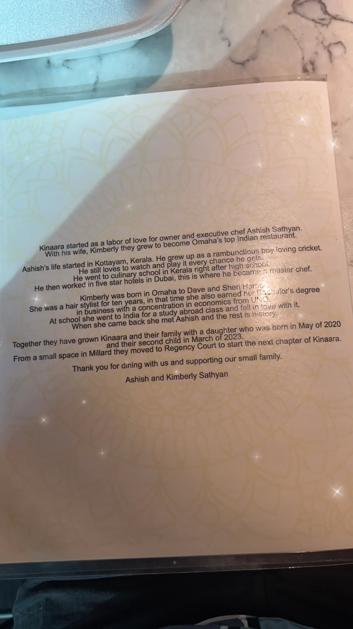 Read moreThis was my very first time eating Indian Cuisine, so I was naturally apprehensive. My son got a recommendation for Kinaara from a coworker who had been visiting Omaha. (I love personal recommendations.) The signage on the outside is very (very) nondescript, but I understand in October 2022, Kinaara is moving to a new location (so probably a good thing).