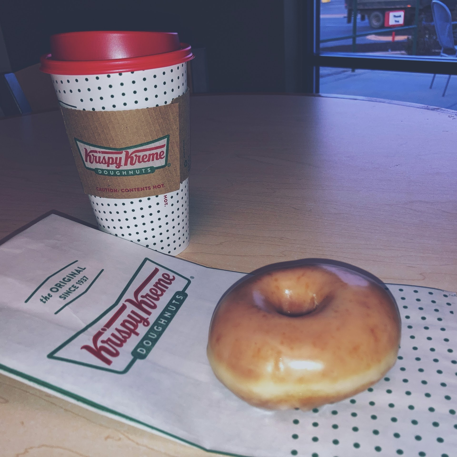 Read moreI had to stop by to grab my free dozen of glazed donuts for my birthday. My friend and I ran in to order and grab coffees. They were not crazy busy but steady in the drive-thru when we walked in. We had to wait a couple of minutes to order, but it appeared they were in the middle of shift changes as well. There was a guy weaving in and out of people trying to clock out I think while one of the another employee was trying to grab our order. Two other employees were making coffee orders and moving around the cash register. My friend ordered a black coffee while I tried the caramel mocha. My coffee was hot but tasted more like hot chocolate than coffee. It was very good tasting but surprised me buy the lack of coffee taste. Our donuts tasted great as usual. This location is a little further away from my home so I’m not sure if I’ll stop by here unless already...