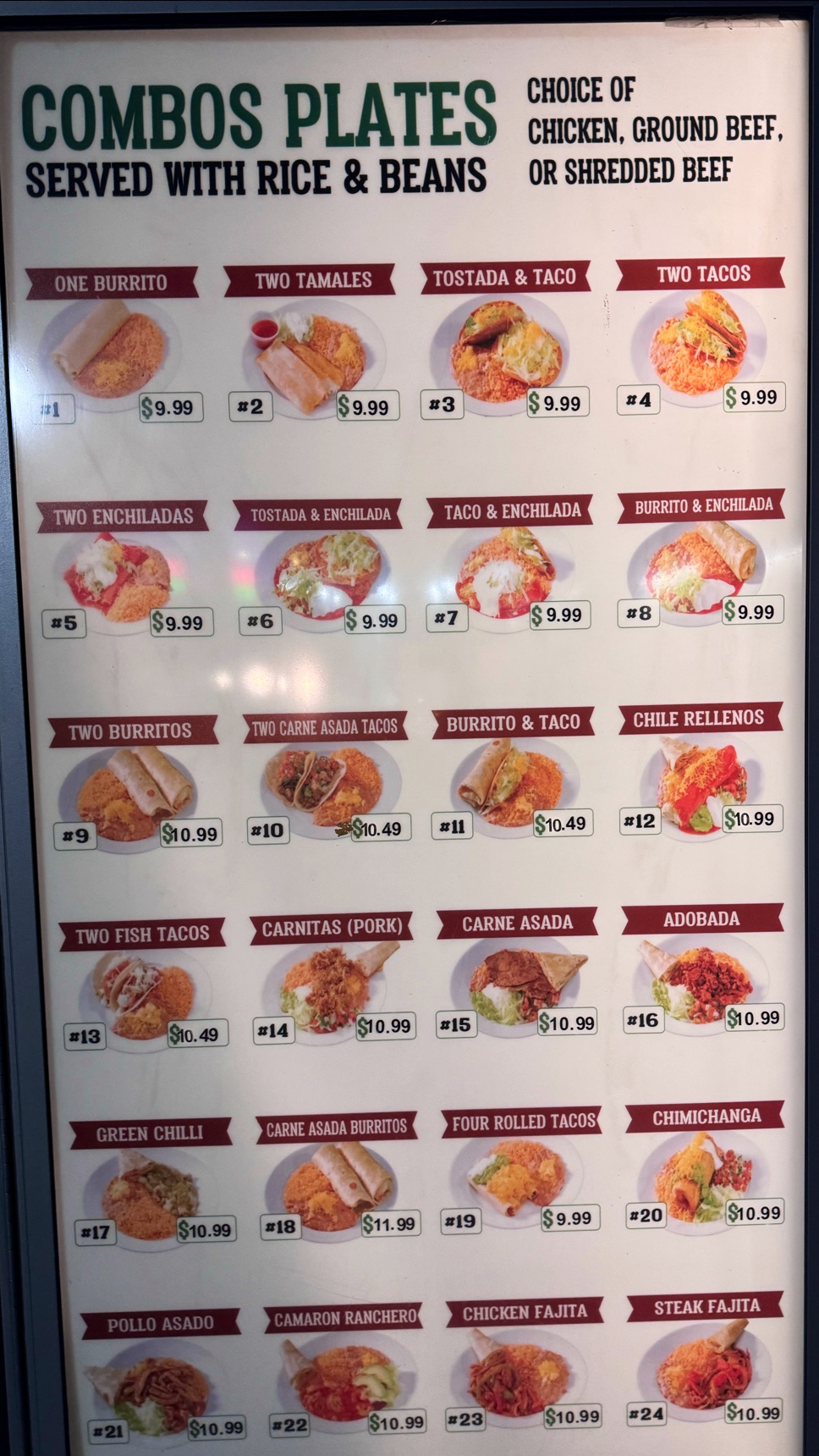 Ā Ā Ā Read moreExcellent carne asada/steak burritos. Their breakfast options and breakfast burrito containing chorizo and sausage are excellent, add potatoes. Did not like the country burrito, vegetarian and needs seasoning. My husband often gets their combination plates 2 enchiladas and #18 2 carne asada burritos. Just tried their chimichangas, OMG, the clouds of heaven opened and sunshine came down. Their rice is exceptionally good; great chicken stock flavor. The beans are creamy, not dry at all, with melted cheese on top. All around, Great place to eat. The service has been fast. The atmosphere inside is fine. And there has not bean any...