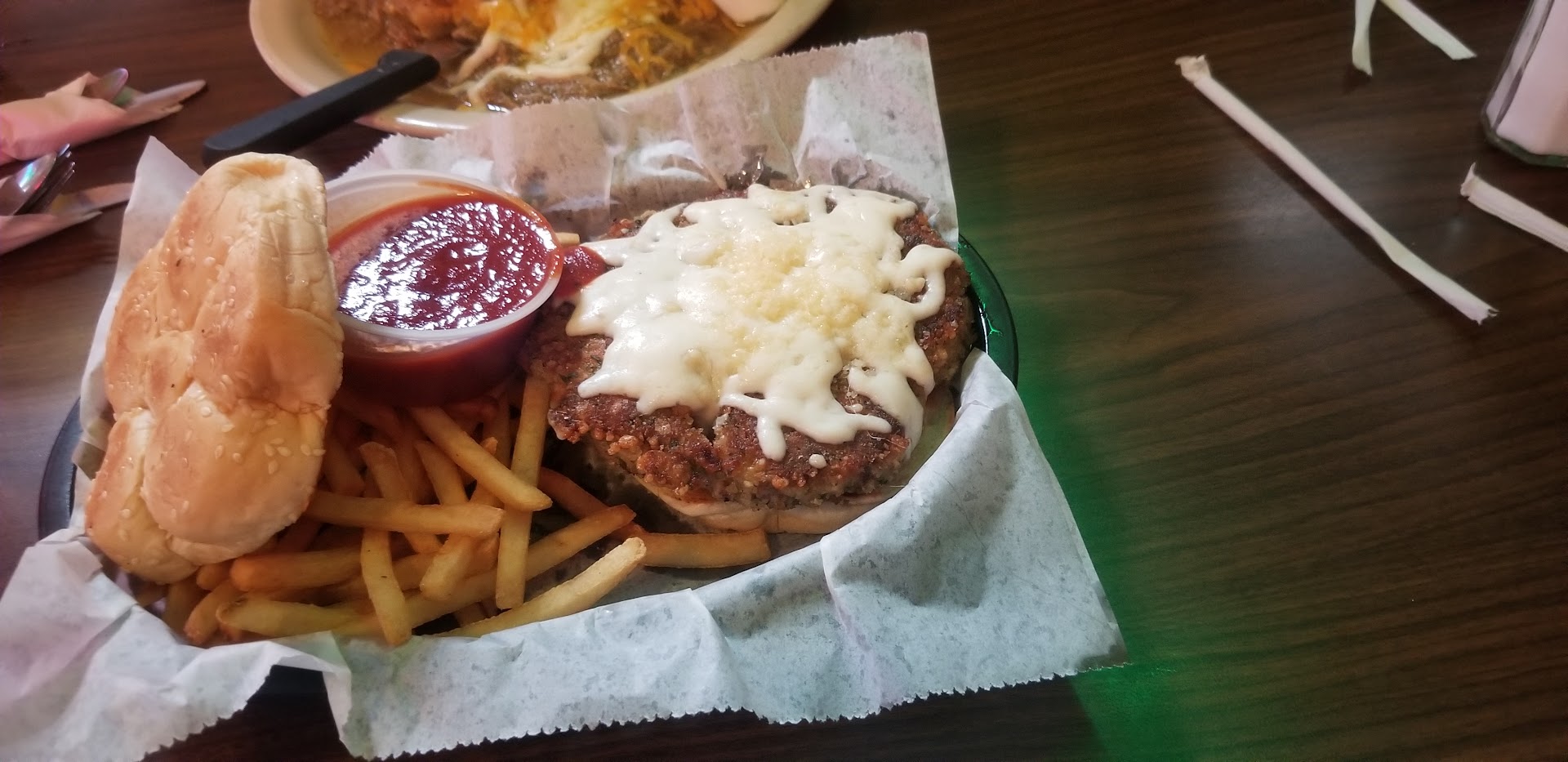 I'm not from the Omaha area. I found my new favorite burger place, if you can call it that. My lady had the breakfast burrito. It was massive, bursting from the seams with bacon and flavor. The green chili was perfect and the other ingredients are fresh. I had the Italian Burger with a side of fries. Let's start with the deep fried potato sticks first. They were piping hot. For an unsalted French fry, they were tasty. Portion size was good. Now to the main event, the burger. The bun was warm, dense, buttery, and lightly grilled. If they don't bake them I house, then there must be a bakery across the street. The marinara sauce IS made in house. Rich, bold, and overflowing with goodness. This sauce drizzled over there hand-made patty. This was no ordinary beef patty. This was a 1/2 pound of Italian infused beefy goodness. The cheese was gooey, hot, and everywhere! This burger is by no means "beard friendly" but that's what napkins are for.