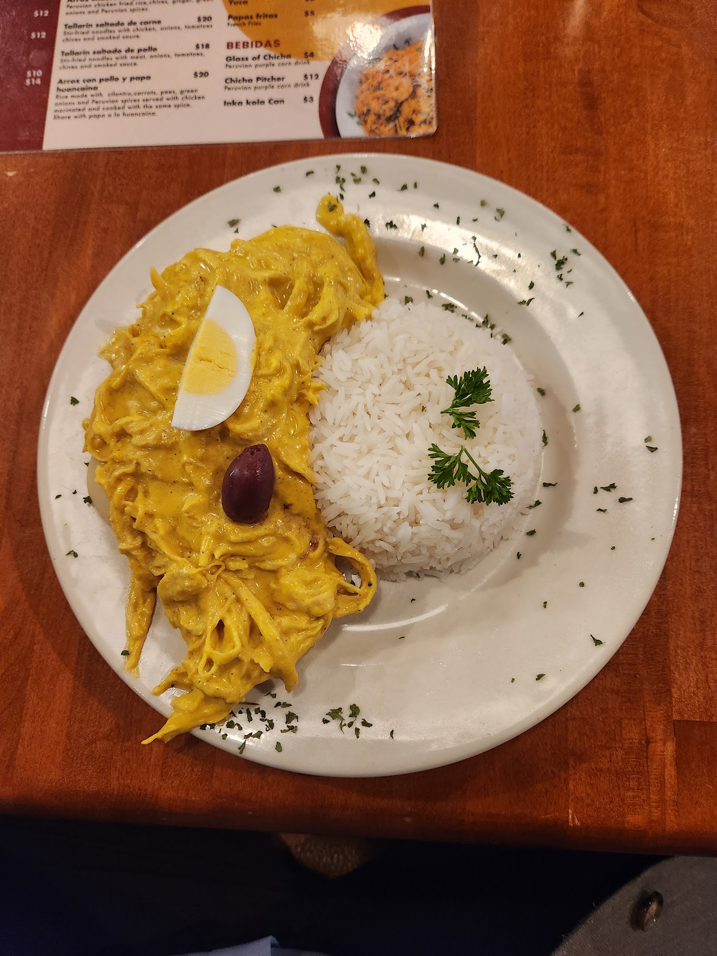 Read moreThe food and presentation were excellent. I had the Ají de gallina which was a creamy mild curry with shredded moist chicken breast with a side of rice and a boiled egg. A friend let try the Arroz con Pollo y papas and WOW! It had an amazing texture and flavor. I will definitely get that one next time.