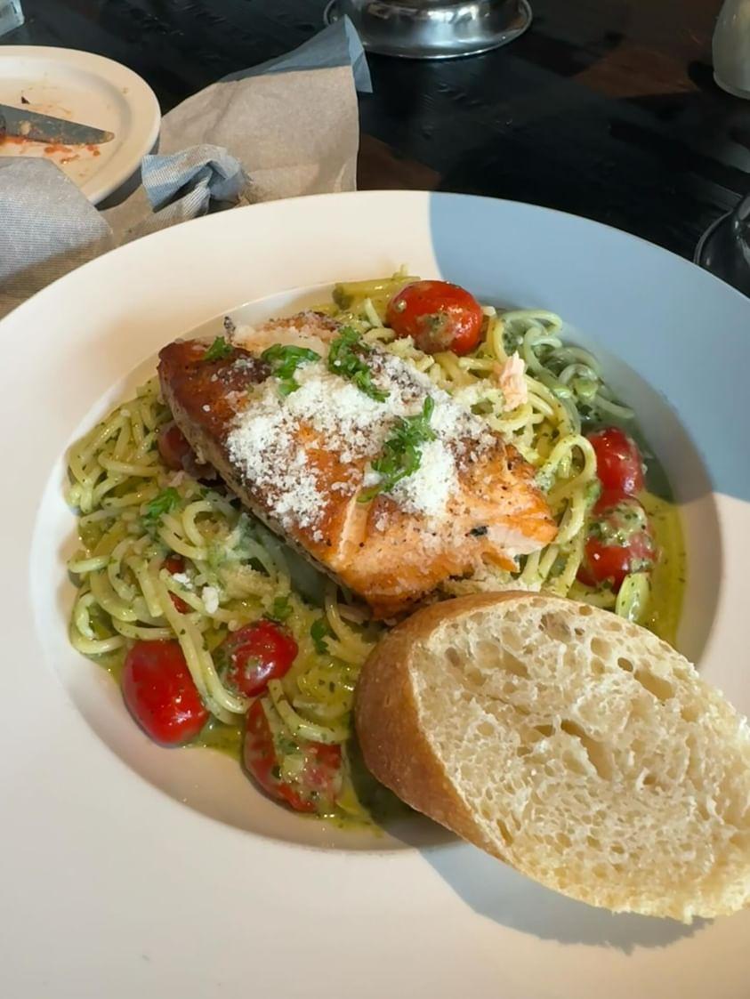 The pesto pasta was great, the salmon was the highlight of the meal, cooked to perfection, with a nice crispy crust. If I could, I'd just order the salmon.