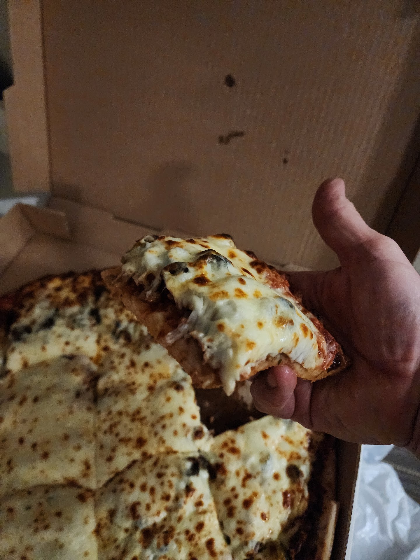 Read more2.27.25 UPDATE... We are back in town at least twice a year and we get in at least 1 visit to Oscars each time. We flew in today so I placed my order ( signed up for txt and received a 20 % off code ) online from our room at Hampton Inn next door. Went over 15 minutes later and the bartender greeted me with smiles and asked if I had a to go order, she handed me the receipt and straight to the kitchen and immediately returned commenting all the way back how heavy the pie was even asking another bar tender to note the weight...haha ... Large Xtra sauce, pepperoni, sausage, onions, blk olives, gr olives jalapeno and most importantly ANCHOVIES with extra cheese !!!! She wasn't kidding...it was heavy... I ate 2 full squares and a corner and I am stuffed 🧸.....wow...just wow...amazing !!!! They are always delicious but this pie....OMG...it was absolutely amazing so many flavors and sooo much cheese....this is without a doubt the absolute best pie they have ever produced for me and likely the best pizza I have ever had...safe to say I loved it !!!! Please see the pictures and do yourself a favor and have them craft you a delicious PIE...try my toppings you will LOVE it !!!!