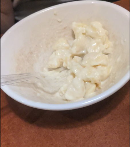 To top it all off, the macaroni and cheese bowl was disgusting. Food remained encrusted within the bowl; obviously cleaned insufficiently, if at all. The grime was able to be scratched off with a plastic fork, so it's safe to say some equipment is broken back there.