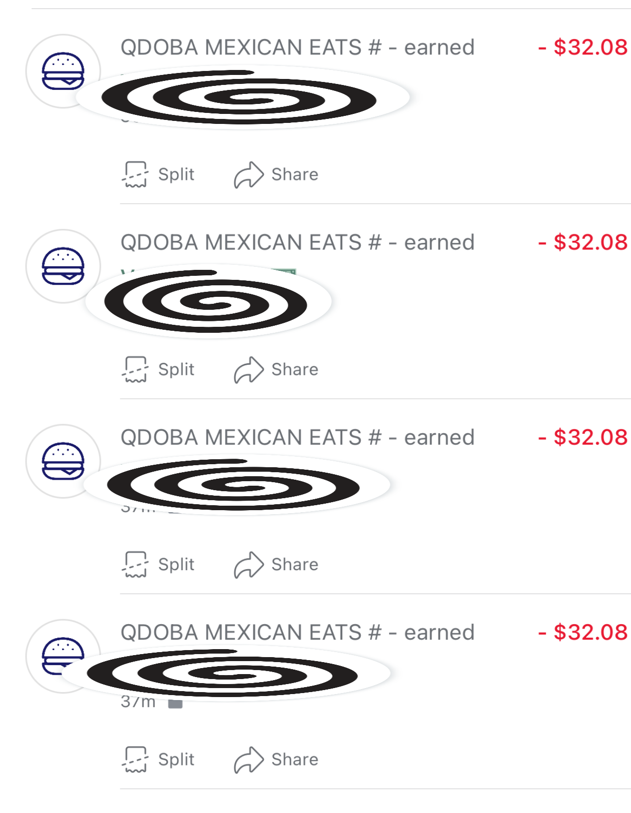 I fed my 10 year old instant rice for dinner last night due to this issue. This morning, I had 2 eggs left for his breakfast. I never made it to my class, or the grocery store. I still don't have my money back and Qdoba took zero accountability. I am going to work with my bank to hopefully remove the transactions, but as of now, I still don't know how I will feed my child and I went without breakfast this morning because I can't buy groceries. Again, I had more than enough money until the Qdoba payment system hit my account over and over again.