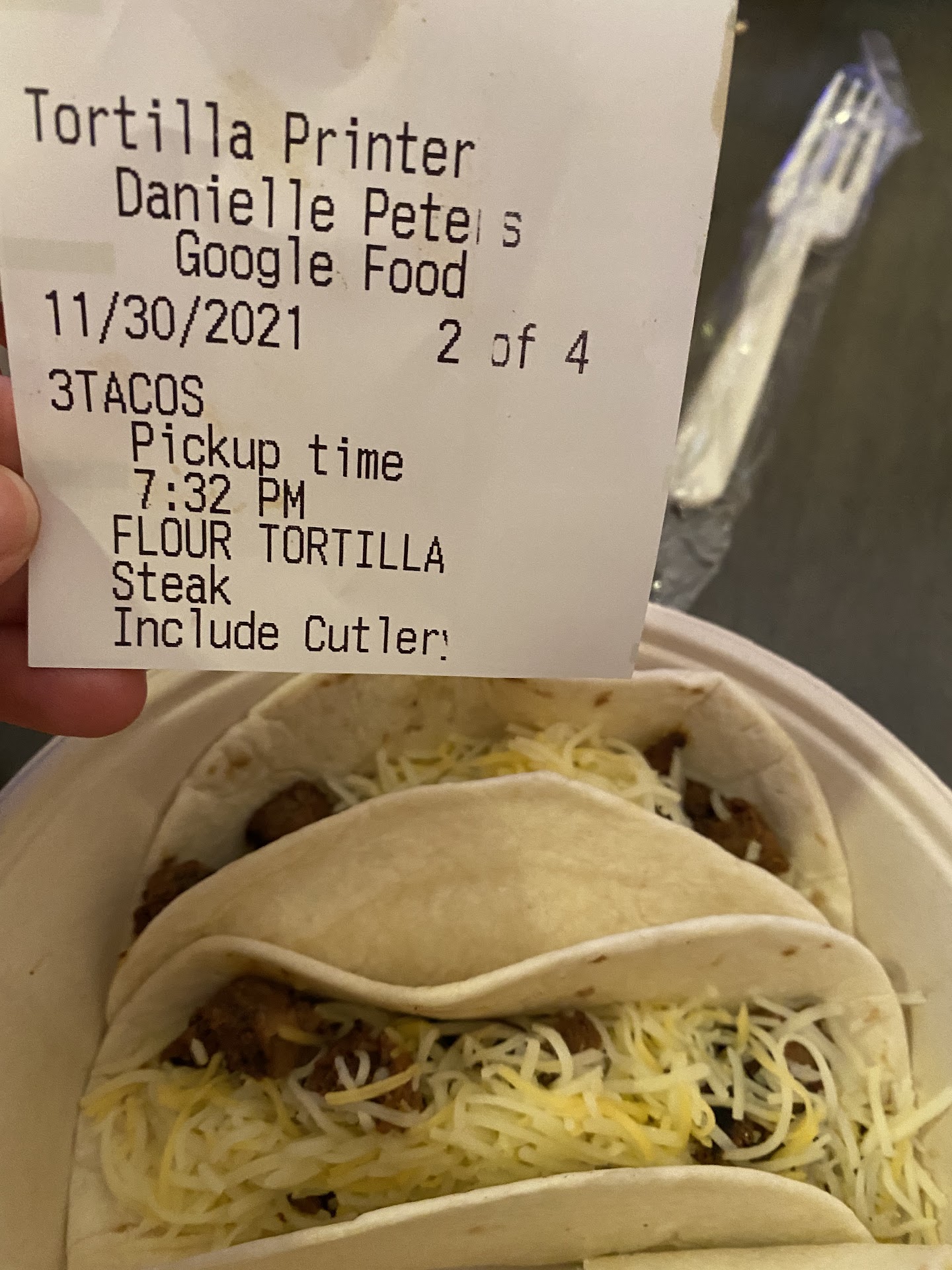 Ā Ā Ā Read moreWent to this location at 6:50pm today and they said due to shortage of staff we cant place orders inside we have to place them online and wait in our vehicle until they were done. There was 6 other cars waiting at this time. There should be no reason we canāt place our order inside and wait I just got off of a 12 hours shift and had to wait over 30 minutes for it with 2 workers standing there doing nothing while the other 2 workers were laughing and taking their time! Better management and better training needs to be done, theres no reason 4 people canāt perform this job. UPDATE: I got my food burrito was fine, they gave me a small queso cheese dip (like what you would put ranch in) my sons tacos were suppose to be plain (shown on the ticket in pic one) and they had cheese and sour cream on them. Mine were supposed to have multiple things on it and it only had cheese and sour cream on it also. What a shame these people can not only take orders in person, but they canāt make the food correctly when the ticket is right there in...