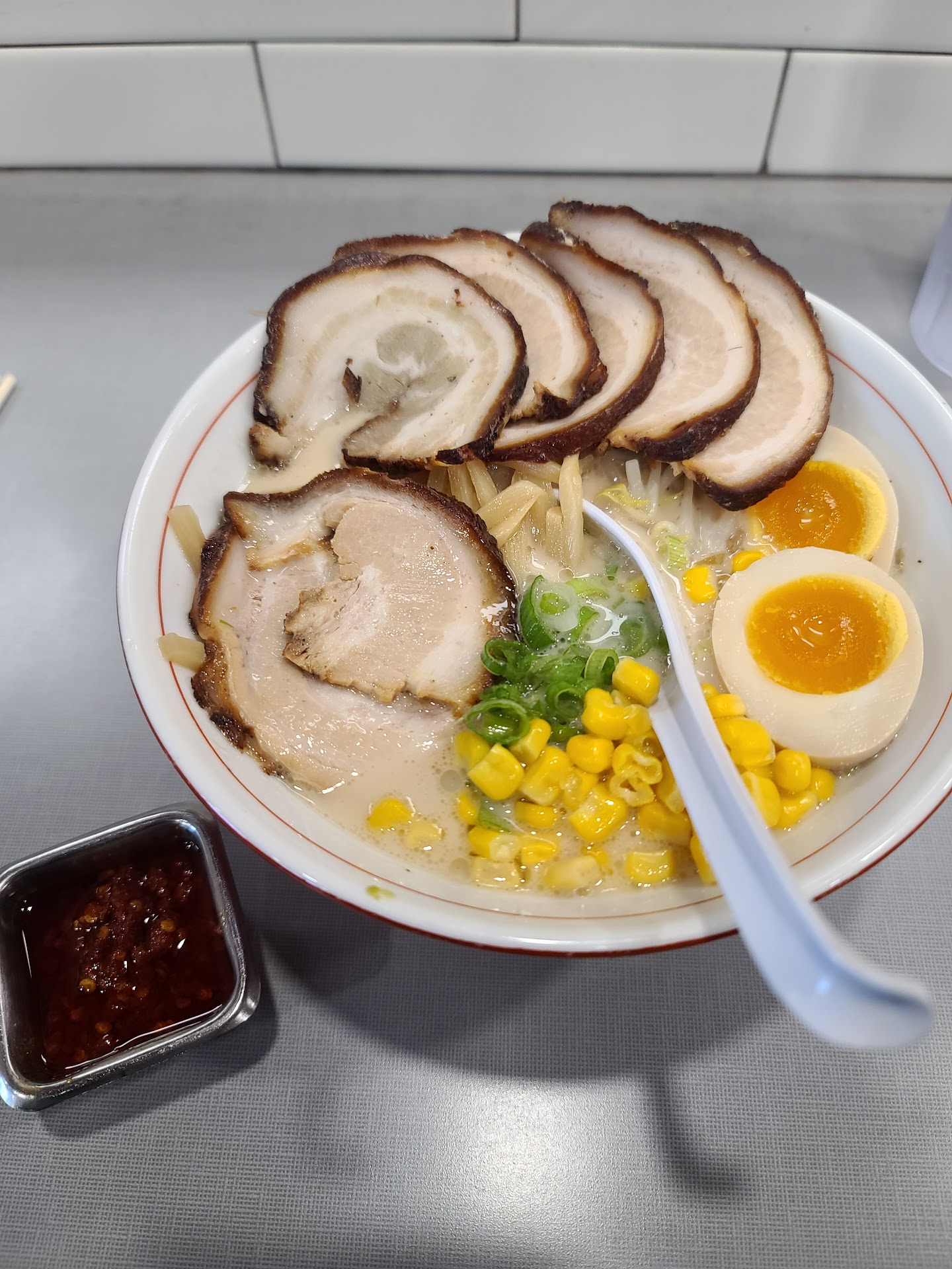 Tonkotsu with extra chashu, corn, ajitama, and spicy chili. Most of the ramen I gravitate towards are bold and intense in flavor that can range into the wildly complex. This ramen was different. I liken it to my experience at the Andrew Zimmern rated Menya Ultra in my hometown of San Diego, in that this bowl while not being the slap in the face trip to flavor town I'm used to, was simple and what I imagine to be one of the most authentic traditional ramen experiences I've had in North America. The flavors just sneak up on you. But you have to slow down and listen for their subtle cues. The broth was absolutely lucious and creamy without being thick or leaving you feeling heavy. It had great aromatics and left me wondering why it was so good at being so simple.