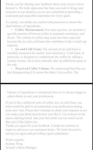 Read moreWent in for my morning coffee order for the office the individual taking my order did not put my order in while taking it I get to the window they don’t have all of my coffees ready or rang in they got my whole order wrong and charged me extra for extra shots a flavor but gave me plain black coffee when I finally get to sit down and drink my coffee I get a mouth FULL of coffee grounds hands down the WORST experience I’ve had by far at any scooters and will never return there were 4 different people working there’s no reason I should’ve had...