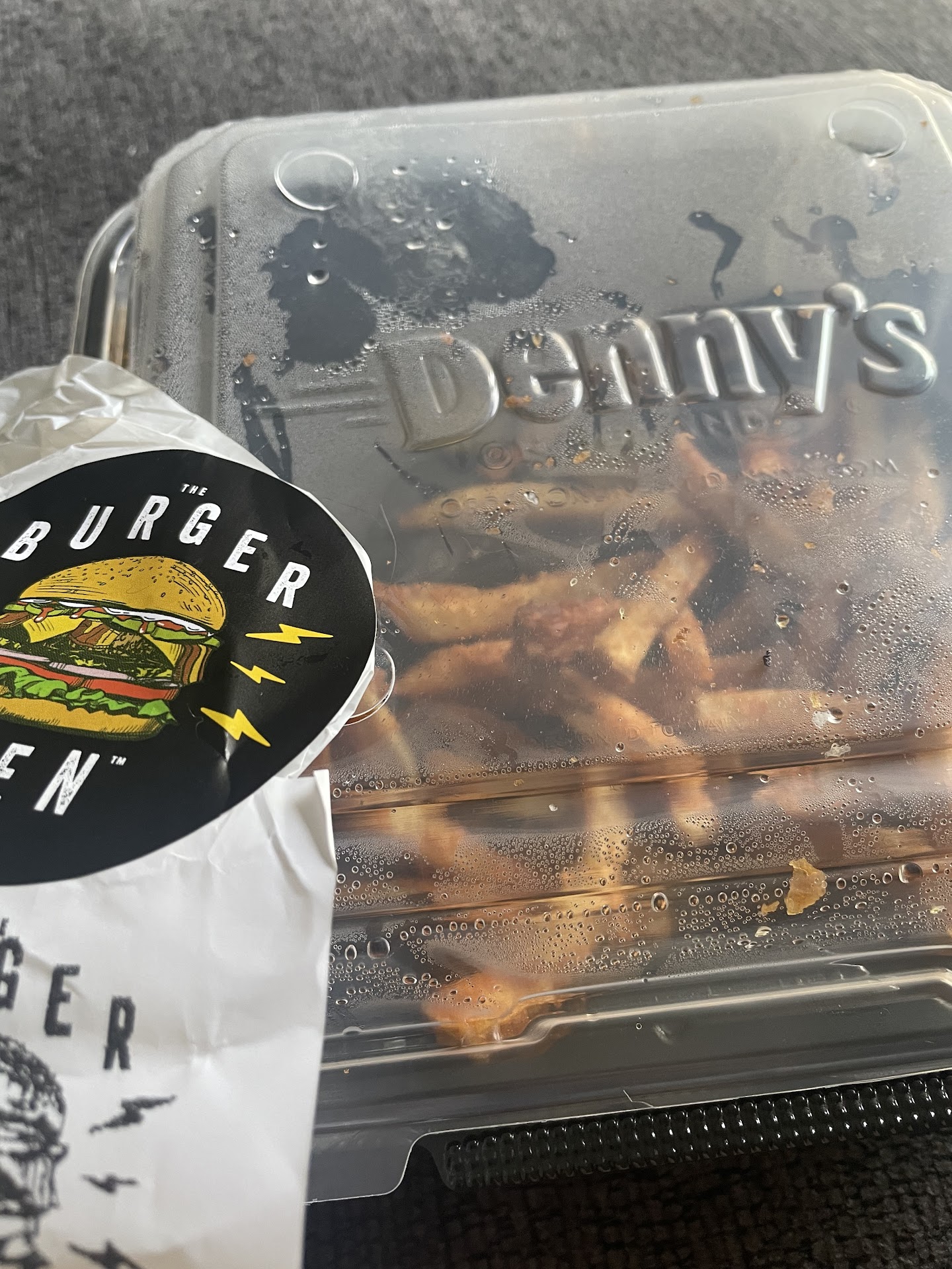 Read moreYeah it just was not good at all. The patties are over smashed it looks like pieces fell off and they didn't even bother to put it back together the flavor is not good it's bland I have to add my own the fries are burnt. So it seems like it's a waste of time to order from here cuz I've ordered a couple times and both times same results. And I recently learned it's not even its own Burger joint it's Denny's. Denny's stick with breakfast your burgers are crap. And yes I had to edit this when I started reading the other comments about this and yeah I was kind of questioning why I have a Denny sticker with a Burger den sticker. Seems like false advertisement to me!!