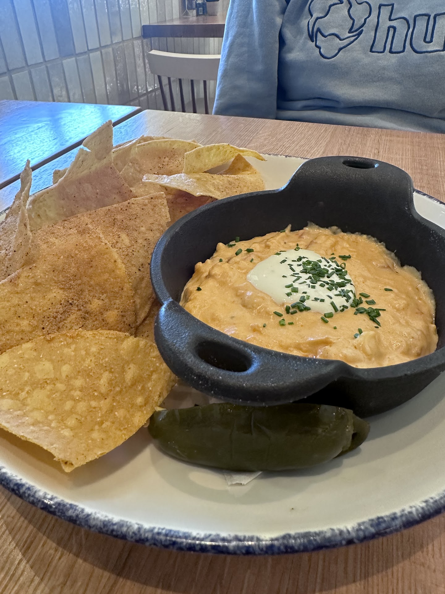 Our appetizer was a hit, with the chips alone earning praise. Topped with a hint of cinnamon sugar, they paired perfectly with the delightful sweetness of the pimento cheese. It's a dish I would gladly order again.