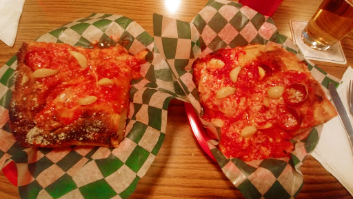 I have a few suggestions for Virtuoso that I hope are good constructive criticism. I want to start first with what I really enjoyed. The atmosphere and service were great. It reminded me of the hole-in-the-wall slice pizza joint I know and love from where I grew up in all the best ways I can mean it. The crust was good with a solid crumb (all the bread inside the crust), the toppings were of good quality, good cheese, and the sauce was tasty. That being said, as a pizza place that precooks pizzas and reheats individual slices when ordered I'm not expecting gourmet level pizza but the kind of pizza that is a good greasy slice of comfort food. In this way the pizza meets the mark.