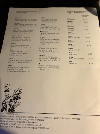 Read moreI had previously given this place 5 stars because their sushi and quality is very good, however, I am updating it to 2 stars because of a few things I experienced the last time I visited. First, the service was not good. Our sushi was brought out to us on a platter and when we asked for small plates because we were sharing everything, they never brought them out. You would think the first thing you would get at a restaurant is a plate. Also, their water glasses are very small and the server didnât even come around to fill up our water once. Although, their sushi tastes good, the price per plate is not at all reasonable for what you get. We are 2 people who donât typically eat a whole lot and we spent nearly $100 for 5 rolls (no appetizers and no drinks in this price) and it didnât even fill us up. We usually spend about $40 for 3 or 4 rolls of really good sushi at other sushi restaurants and get very full. Another thing that really took away from the overall experience and opinion of this place is that the restaurant is VERY stingy. They donât offer any of the basics that every other sushi restaurant offers, for example, no ginger or wasabi, no kids chopsticks, no dessert menu, no basic appetizers like gyoza, egg rolls, etc. and we were charged $3 for a side of spicy mayo and eel sauce which was very upsetting. We always get a side of spicy mayo and have never been charged extra for it, let alone $3!! You have to ask for soy sauce and when they pour it for you, they literally only give you a few drops. Their extreme penny pinching made this place very unattractive to us.Once we even asked if the sushi chef could add spicy crab to the top of a plain roll that had nothing else on it and they said they couldnât do it. This a very tiny restaurant and they only have maybe 10 tables. Getting a table is usually pretty difficult and I realized why. They take reservations with the expectation that each party will spend 2-3 hours there. Service is very slow and your sushi doesnât come out until about an hour after you have ordered so they can get you to order more drinks and appetizers while you wait. Such a waste of time if you want to just sit, eat and leave and donât want to spend more than an hour there. All in all, very disappointed...