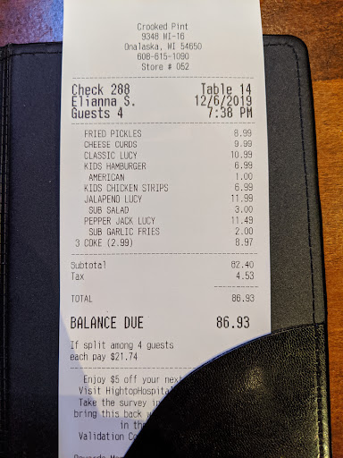 Read moreMy mom and I stopped in for dinner here last night, Tuesday. Arriving about 6p the place was full but not bustling busy, thankfully. Upon checking in w the hostess I asked for a table, not a booth nor a high top table. Turned to scan the restaurant "ahh regular tables seem to be at a premium!" The hostess had two tables I couldn't see that were beyond the bar, so she immediately took me to one. Mackenzie was our friendly server. We just missed happy hour, my mom didn't care "it's probably only $1 off anyways" so she opted for a New Glarus Moon Man to par w her burger dinner. We both opted for the Oklahoma Smash Burger w waffle fries. Mine was sans "smothered in onions". The burgers hit the spot and can you ever go wrong w waffle fries?! The food was out quick and hot. When first seated, having never been before I asked our server Mackenzie if she had any favorite meals? All of which sounded delicious but something to look forward to on future visits. She recommended the Salmon Salad bowl which had recently changed the sauce so wasn't a favorite any more. She also said the chicken tacos are a solid choice and then of course a juicy lucy. Which maybe we'll come back on the 12th "National Juicy Lucy Day" when they're on special for $9.12?! Actually I was quite impressed by their page of specials! With the good food and great service we will definitely be back! Thank you Mackenzie and Crooked...