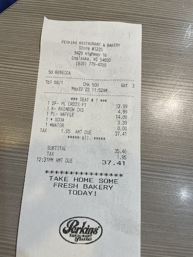 Ā Ā Ā Read moreI am from Onalaska and this restaurant is Overdue for a remodel. The floors are terrible, they are sticky and the main walkway carpet is BLACK. They don't even try to cover it with a rug. My shoes stuck to the floor when walking on it. The entry did smell pretty bad but the bathrooms were okay. Our waitress Rachel was GREAT. She was overloaded with customers and working her tail off. Unfortunatley there were two hostess ladies standing at the front a lot doing nothing. One hostess was annoyed when a customer returned a dirty glass of orange juice to her (not HER job). She was busy putting a new menu flyer on each table and ignored the dirty tables all around us. Rachel was the only one taking dishes. She is by far the BEST waitress I have seen in a long time. The other waitress seemed to be doing their jobs fine but I even heard the hostess girls at the door talking about how many tables Rachel had and they seemed to think that was funny. HOW SAD! Also... the hostess gave us a box to fill up with muffins, ect. as part of their normal Up selling....the bad part was that the box was very dirty. It looked like it had sat at 50 tables and never been used. If you want someone to buy bakery don't give them a box with old food, fingerprints and smudges all over it. Perkins also changed their coffee to a darker brew. Didn't care for that brew at all. I loved their coffee and sad to see that changed. We used to love our Perkins but this had to be told. I have also left the comments to the resturant and hope they will CLEAN the place up. While they are doing that they need to train their staff to be a TEAM. Kudos to Rachel for being a graceful and talented waitress, you deserve a better...
