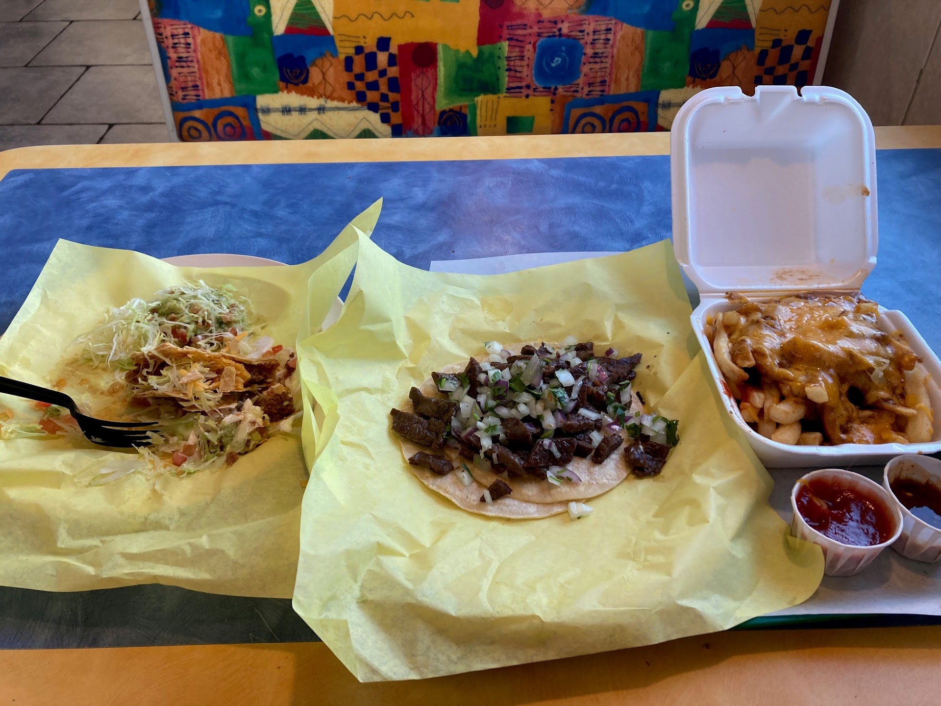 Read moreHad a little time before my flight out of Ontario and needed lunch. Stopped by around 2PM on a Wednesday. First time in the area and at this establishment. Chose it because of proximity and I saw it while at the adjacent place getting gas. Plenty of parking available. Was able to get right up to the counter and the girl taking my order was friendly and courteous. She helped explain menu options so I could make a selection. Speaking of the menu, it is quite diverse with typical Mexican fare and other stuff like burgers, sandwiches, salad, hot dogs, etc. I ordered a steak taco, a ground beef taco fixed up like a "supreme" and a side order of chili cheese fries. Got a couple samples of sauces for my tacos as well. Ticket was up in the $20 range once drink and tax were added. Food was ready in about 7-8 minutes, which wasn't too bad. Everything was hot and fresh and overall I was happy with my choices. Reason for 4 stars was steak was a little dried out and chewy. Beyond that, it was a positive experience. I will try this location again, and I would recommend to others to...
