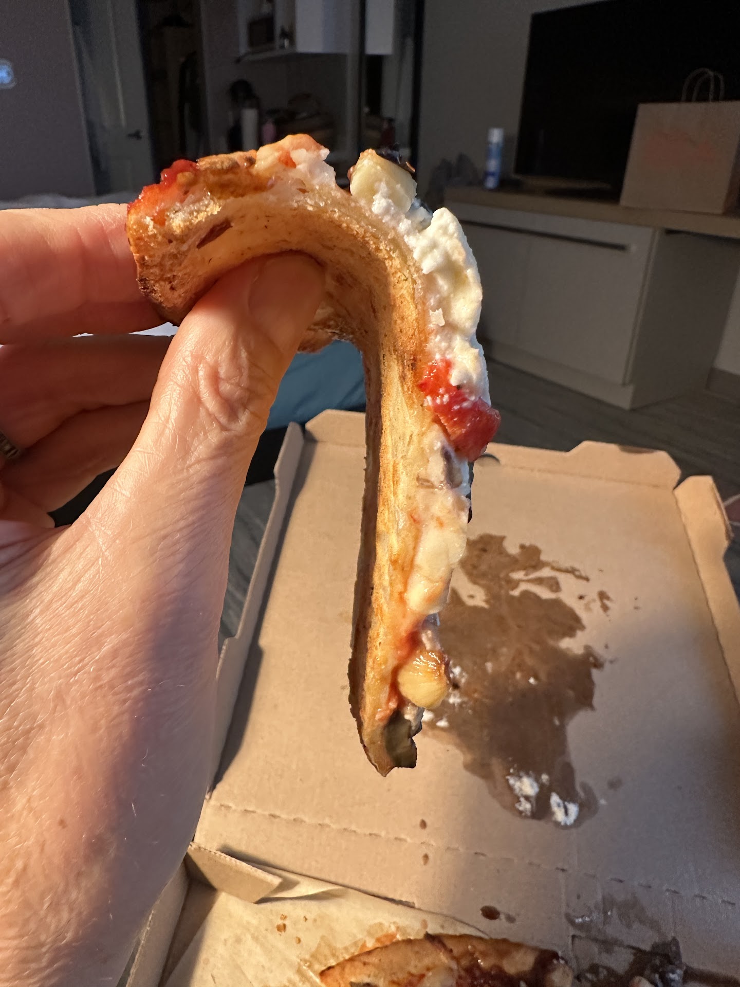 We made an online order for the two pizzas (which we asked to be cooked “extra crispy” with the crust); two drinks; two desserts order and added in a Caesar salad. Also added in were 2 ranches; parm; red pepper; napkins and utensils. When I arrived and told them I was there for my pickup, the slack faced employee pointed to two pizza boxes with two ranch dressings on top and said “there!” I looked at it and said, “no, there was more”. Confused, he looked around, located two cups, put them onto the pizza boxes and said, “There.” I then said: “no, there’s more.” Another employee then pointed at another location, and they added the salad and a dessert to the stack. Looking triumph, he said “there!”. I then looked dubiously at the dessert and, wondering if they somehow stuffed two desserts into its little package, decided they did not, and said “no, a dessert is still missing.” Another employee walking by said, “oh, you ordered the s’mores pie as one of the desserts, but we’re out. Would you like to have another brownie instead?” I agreed and this was added onto this horn of plenty. I took the stacked food over to the drink station, looking forward to at least adding in lemonade, but the lemonade dispenser was down to its last film of liquid - not enough to fill a thimble. So I got root beer instead. I then realized that I was missing utensils and napkins, so I grabbed some and added them on. At this point, I didn’t think that this leaning tower of pizza would make it back to my car, so I went to the cashier and asked for a bag, which I was cheerfully given. When I got this cuoncophney back to the hotel, my wife asked about the parm and red peppers, and I realized they were unfortunately left of the order as well. The Caesar salad was some iceberg lettuce (and not the good parts), parm and shaved cheese with a container of dressing. This was a disappointment, but that pailed in comparison to the pizza. THAT was as cold and limp as a 50 year old who forgot his Viagra. But, even though it just sagged there, it at least still tasted “ok”. As bad as that was, I’d have to say my biggest disappointment was the sheer incompetence of the staff in even assembling our order and having it...