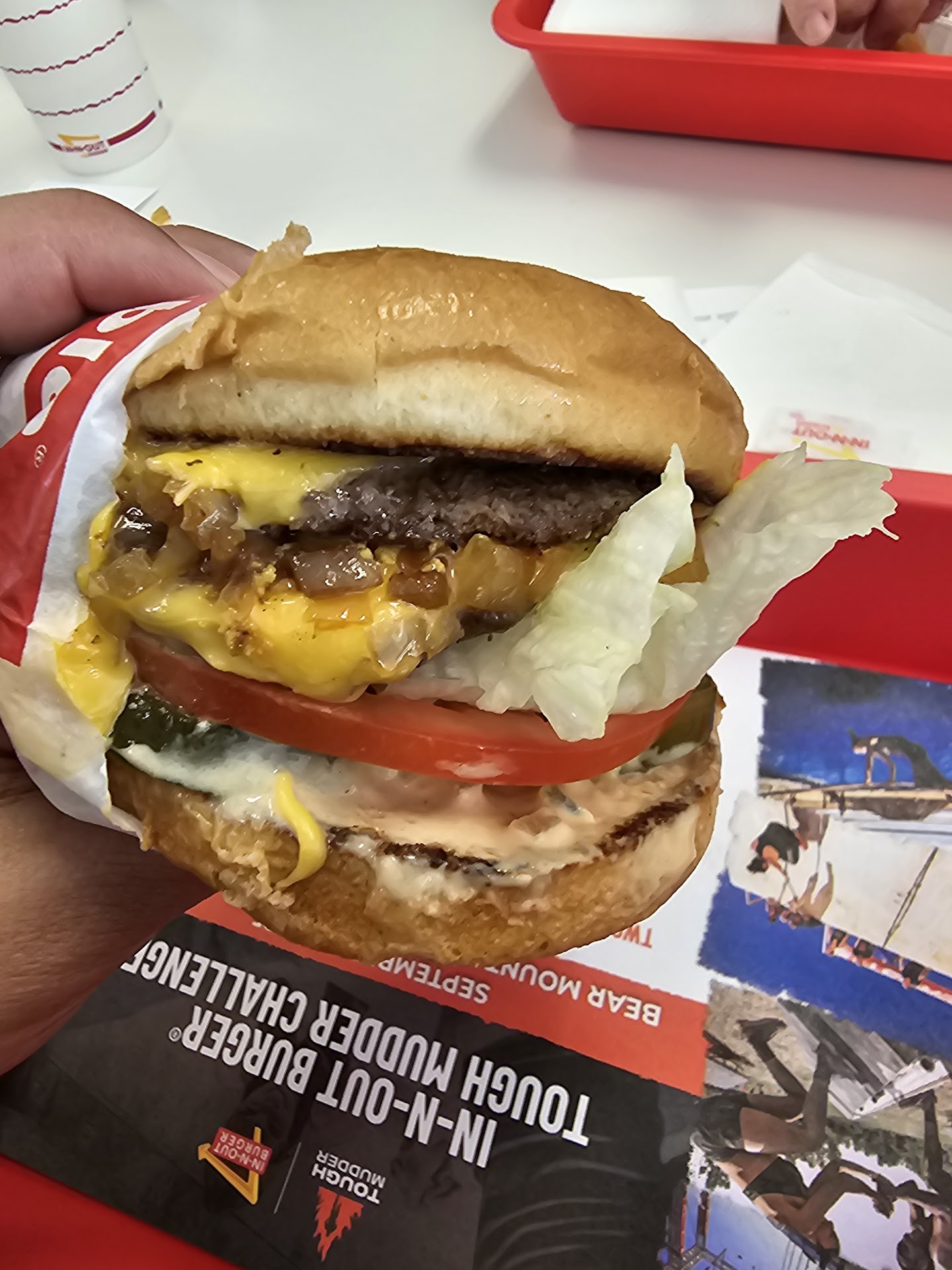 Now, onto the real reason for the visit: the food. I went with an Animal Style burger, one of In-N-Outâs famed âsecret menuâ offerings that isnât so secret anymore. If youâre unfamiliar, this option transforms the standard burger into a decadent experience, loaded with grilled onions, extra sauce, mustard-cooked beef patties, and gooey melted cheese. Itâs messy, itâs indulgent, and itâs exactly what I needed to rekindle my In-N-Out nostalgia.