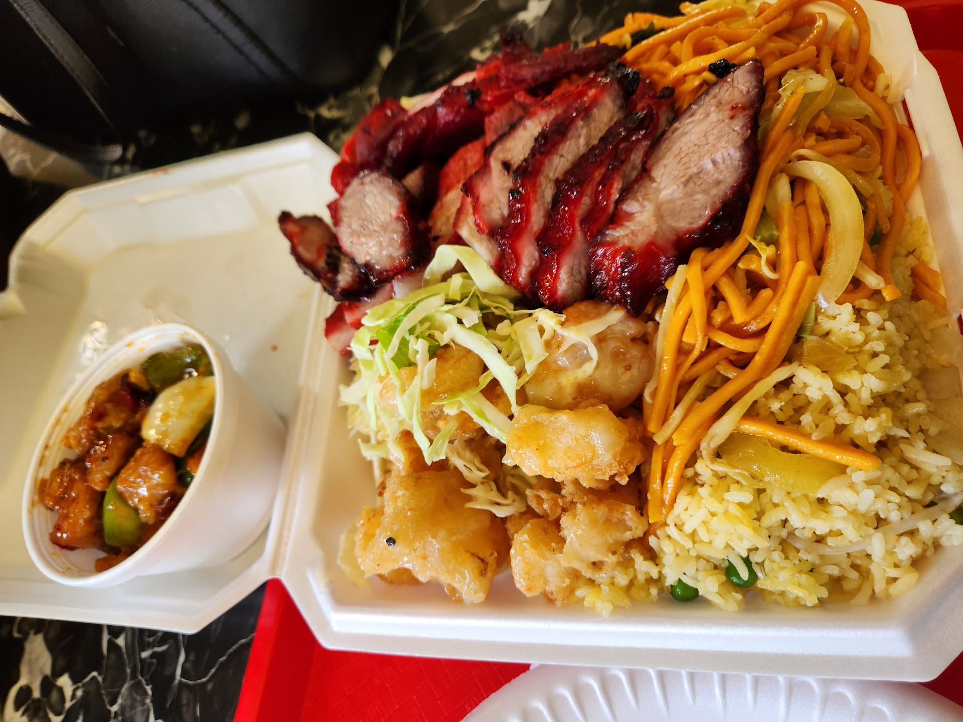 1 star for portion size. And another star for my somewhat good/friendly customer service experience (first time customer). Now let me get real..the food is TASTELESS and cold. That might be a good thing considering that they might not add any extra seasonings/salt due to health risk but who knows for sure but looking at the BIG QUANTITY of food they give you..im highly doubting that now. Anywho, the "chicken". The "CHICKEN" dont taste like CHICKEN. It honestly has a weird taste and texture to it (not just my opinion but i double checked with my husband). BUYERS AND EATERS BEWARE! It might not even be chicken, we didn't finish it. During the time when we were half way eating my stomach began hurting bad i couldnt eat well at all Which i thought was really weird. To add to all this my son came home sick from eating at this place. My husband got some really bad side effects too. And the smell on them both....phew! Naaasty! I know it's TMI but this is just to give you an idea how bad. Again, CONSUMERS BE-WARE!! Oh and another thing i forgot to mention, while we were there we over heard the man yelling at some customers. Rushing and yelling at them, asking them to choose something, anything. Cause apparently "they make anything you want, just order already" (and be gone. As i saw it). The customers just stood there. I didnt hear whether they were answering him but they took a couple more minutes to decide and make a call. This man, yelling, caught everyones attention in the place. It was quite an odd experience i had as a first timmer here and new to the city/county. Will honestly say that i wont be going back...