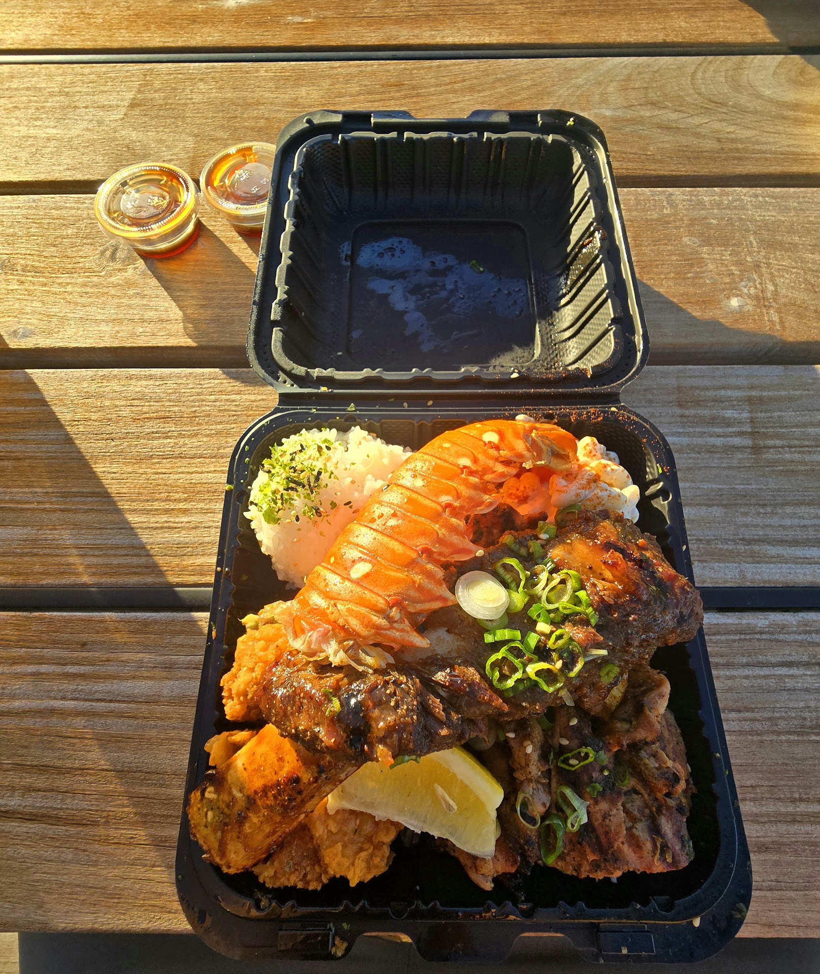 All of the meat was tender, the beef rib was easy to cut into with a plastic knife. Not too fatty with a good amount of meat. The chicken was moist and the sauce it came with was not too salty. Lobster tail was already removed from the shell and it was tender. I do like the crispy shrimp with Cajun garlic butter. It was crispy enough that the shells and tail can be eaten, they gave enough sauce for all the shrimp and the size of them were good.
