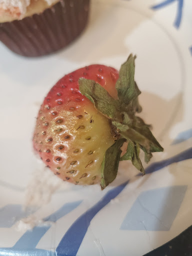 This was my first time back. I returned because people mention this place often enough so I thought it would be a different experience. Purchased multiple cupcakes. Again they were absolutely gorgeous but again rather blah for what you'd expect. Not a huge deal. I avoided the cupcakes with the flowers this time but did get one with a strawberry on top. Went to pick up the strawberry and was looking at it so I could grab all of the green at the top to hold it when I noticed yet another dead gnat. Not smashed this time just crumpled up on the strawberry.