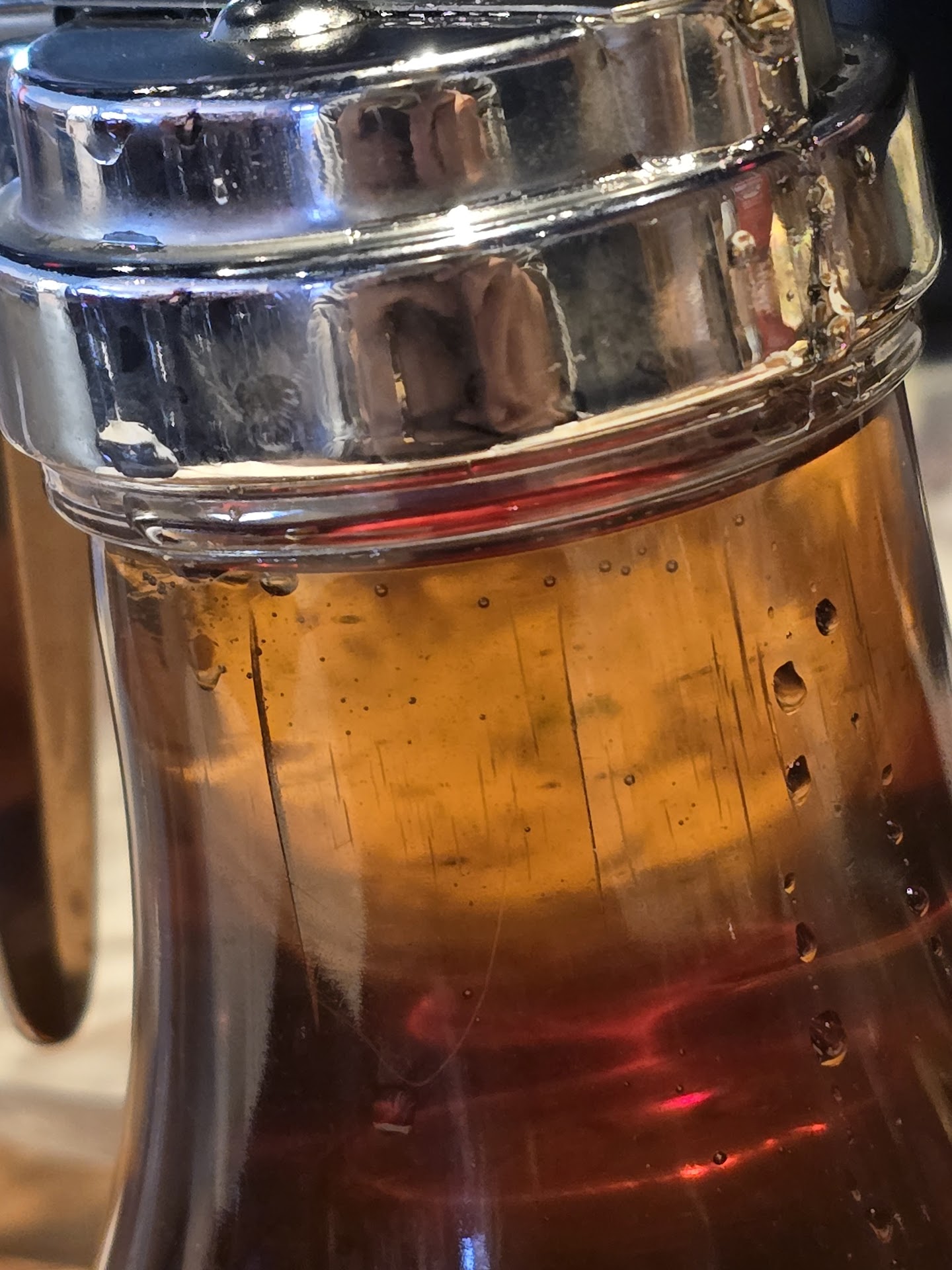 (Other imagine is another syrup dispenser our server just switched out for us; the one with the metal cap.) Also, the syrup dispenser we had that had water in it was given to a different table from ANOTHER server.