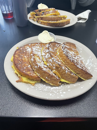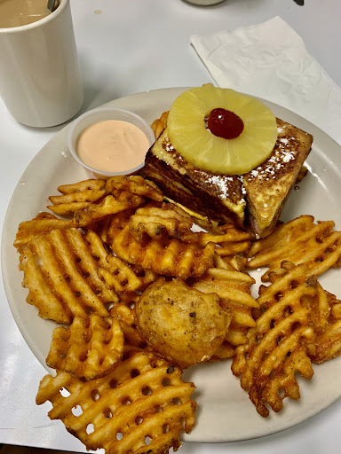 Today I ordered the Monte Cristo (turkey, ham, American and Swiss cheese sandwich, dipped in egg batter and grilled, topped with pineapple ring, maraschino cherry and powdered sugar, $9.25) with a side of waffle fries and my husband got the stuffed strawberry French toast (filled with sour cream filling topped with strawberries or blueberries compote and whipped cream, one slice $6.25 or 2 slices $8.25). I've only had one other Monte Cristo in my 23 years of existence so I'm not sure what constitutes a supreme one but I thought mine was delicious! The bread was so good! Tasted like French toast! I spread blackberry jam on it for some POW and dang did it deliver! The fries dipped in fry sauce paired excellently. My husband thought his French toast wasn't as "filled" as promised but still enjoyed his meal! He helped me finish mine plate, heehee.