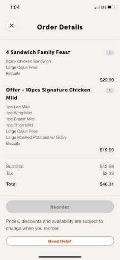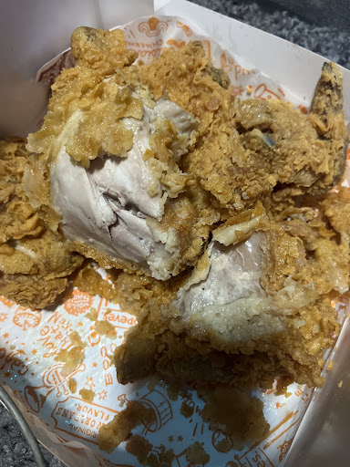 All the food was correct in the order. The chicken sandwich was tasty and fresh; the 2-piece meal was wonderful - fresh, crispy chicken served piping hot with creamy mashed potatoes and flavorful gravy. The wings were saucy and sweet with a mild hint of heat, and the chicken tenders were light and crispy. Even the fries were hot and crispy. Everything here was good, and we all enjoyed the pleasant helpfulness of the staff.