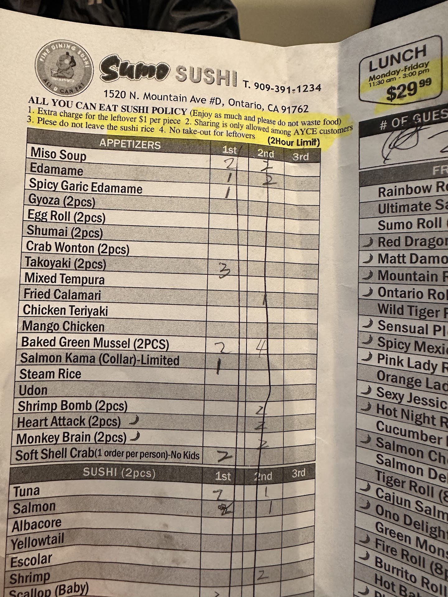 Ā Ā Ā Read moreIt was terrible and way overhyped. Dinner starts at 3 pm and cost 38 dollars per person. If you leave even a single piece of food, they force you to eat it or else charge 1 dollar per piece. The waiters were extremely rude when I asked them why one of the pieces of sushi had no fish in it and said āthis is how we make it if you donāt like it too badā. The rice to fish ratio is insane as there are basically no fish to a clump of sticky sweet and stale rice. Also isnāt all you can eat as they limit the amount of times you can order to 3 rounds. The tempuras are stale and dry.Atmosphere was very noisy and dirty. If you want good food donāt come here but if you want to get scammed, feel free. You are better off eating a hotdog at Costco which taste better, cost less, and comes with a drink. (Their soft drinks donāt offer refill). If you thought this place was good then maybe try some actual high end restaurants that isnāt in this rather broke and...